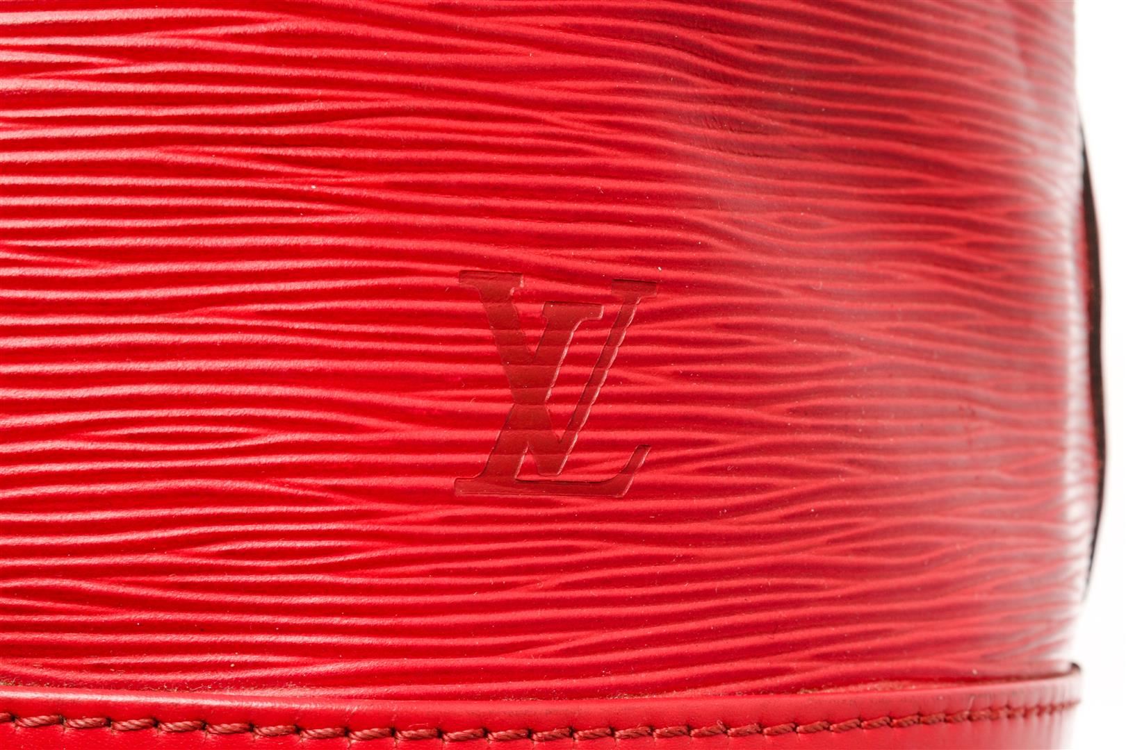 Louis Vuitton Red Epi Leather Noe Bucket Bag. All available information is listed in the description and shown in the photos. Louis Vuitton Red Epi Leather Noe Bucket Bag with red epi leather, printed, gold-tone hardware, single adjustable shoulder strap, alcantara lining, drawstring closure at top. Height: 13.5" Width: 10.5" Depth: 7.25" Shoulder Strap Drop: 8.5" / Height: 34.29 cm Width: 26.67 cm Depth: 18.41 cm Shoulder Strap Drop: 21.59 cm
