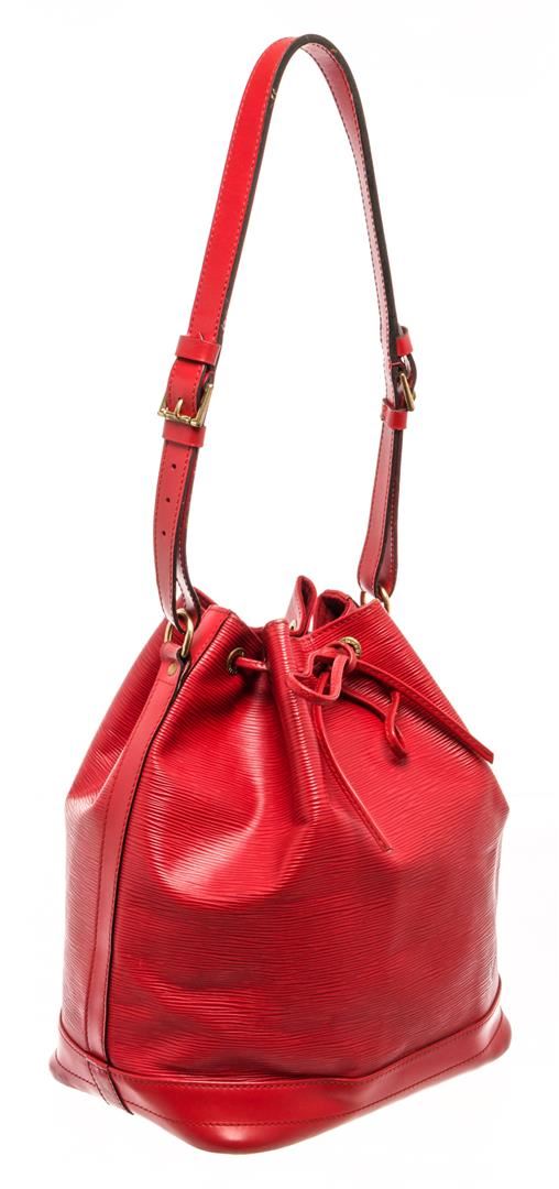 Louis Vuitton Red Epi Leather Noe Bucket Bag. All available information is listed in the description and shown in the photos. Louis Vuitton Red Epi Leather Noe Bucket Bag with red epi leather, printed, gold-tone hardware, single adjustable shoulder strap, alcantara lining, drawstring closure at top. Height: 13.5" Width: 10.5" Depth: 7.25" Shoulder Strap Drop: 8.5" / Height: 34.29 cm Width: 26.67 cm Depth: 18.41 cm Shoulder Strap Drop: 21.59 cm