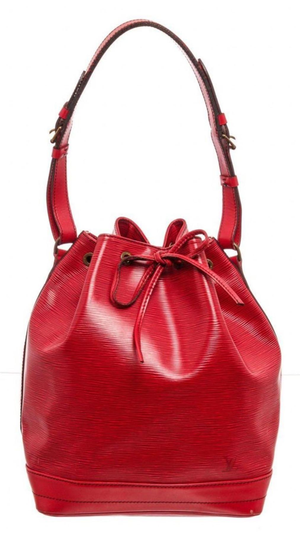 Louis Vuitton Red Epi Leather Noe GM Bucket Bag with material epi leather, gold-tone hardware, trim tan vachetta leather, shoulder adjustable strap and drawstring closure.