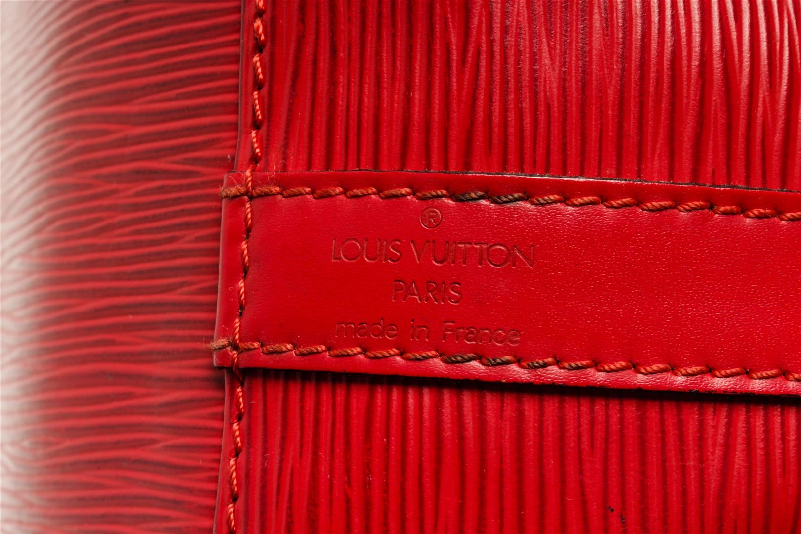 One Louis Vuitton Red Epi Leather Noe GM Shoulder Bag. Item is sold AS-IS. All available information is listed in the description and shown in the photo. louis vuitton bucket bag, rouge epi leather, brass hardware, single adjustable shoulder strap, alcantara lining, drawstring closure at top Height: 13.5", Width: 10.5", Depth: 7.25" / 34.29 x 26.67 x 18.41 CM
