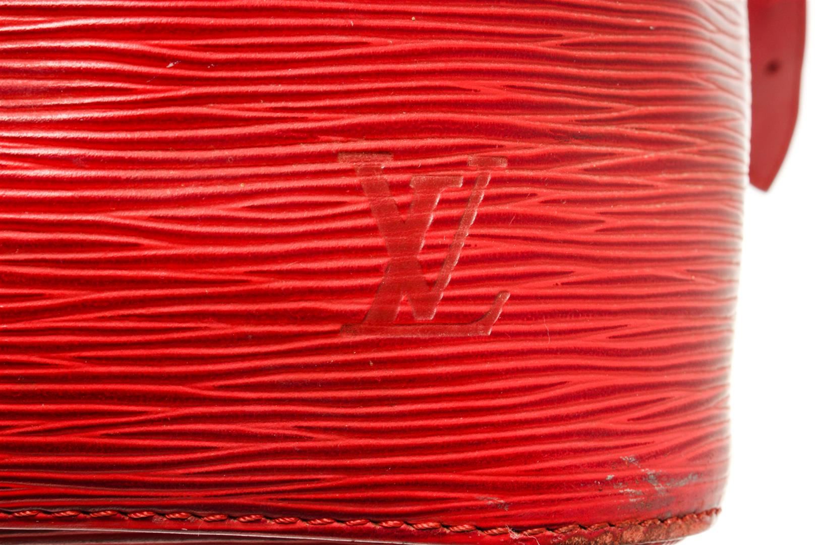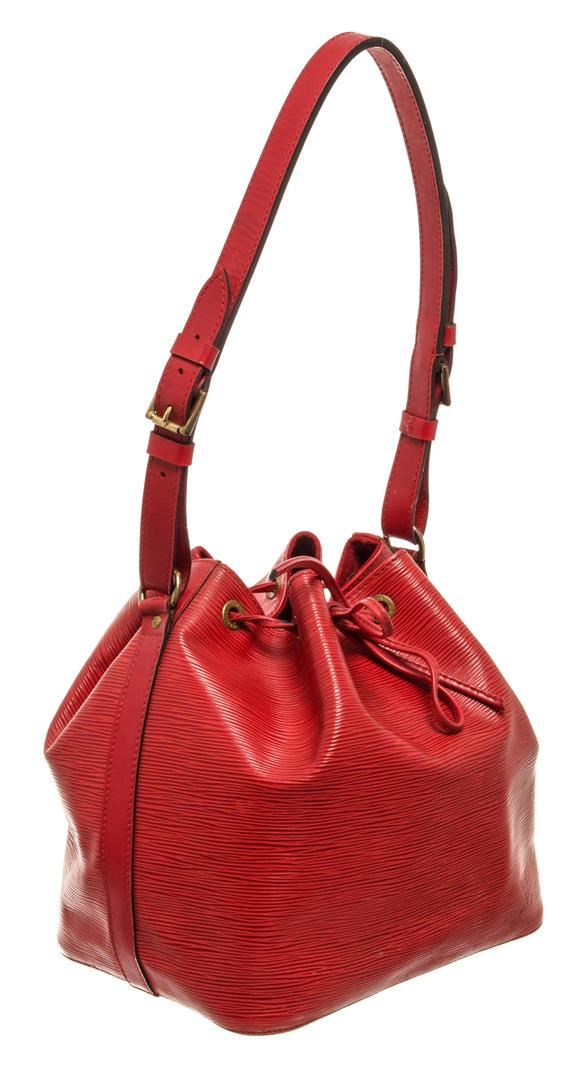 One Louis Vuitton Red Epi Leather Noe PM Bag. Item is sold AS-IS. All available information is listed in the description and shown in the photo. Louis Vuitton Red Epi Leather Petit Noe Bag with gold-tone hardware, red leather trim, red suede lining, single adjustable leather shoulder strap, and drawstring closure. . Height: 10.5" Width: 10" Depth: 7.5" Shoulder Strap Drop: 11"