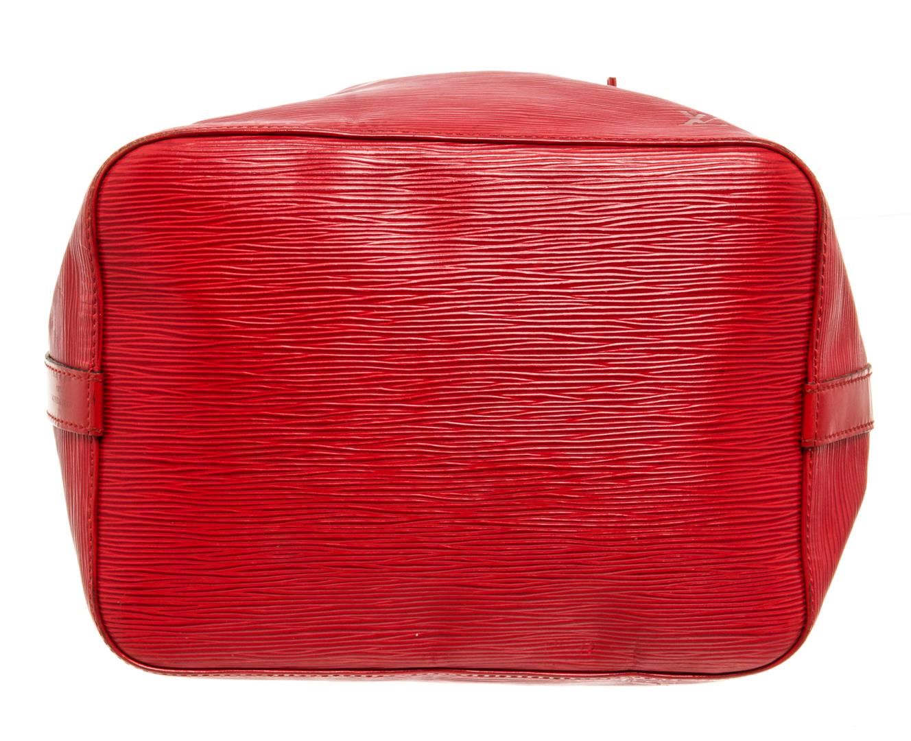 One Louis Vuitton Red Epi Leather Noe PM Bag. Item is sold AS-IS. All available information is listed in the description and shown in the photo. Louis Vuitton Red Epi Leather Petit Noe Bag with gold-tone hardware, red leather trim, red suede lining, single adjustable leather shoulder strap, and drawstring closure. .