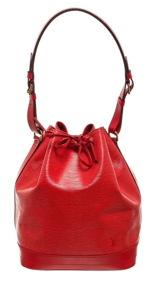 One Louis Vuitton Red Epi Leather Noe PM Bag. Item is sold AS-IS. All available information is listed in the description and shown in the photo. Louis Vuitton Red Epi Leather Petit Noe Bag with gold-tone hardware, red leather trim, red suede lining, single adjustable leather shoulder strap, and drawstring closure. .