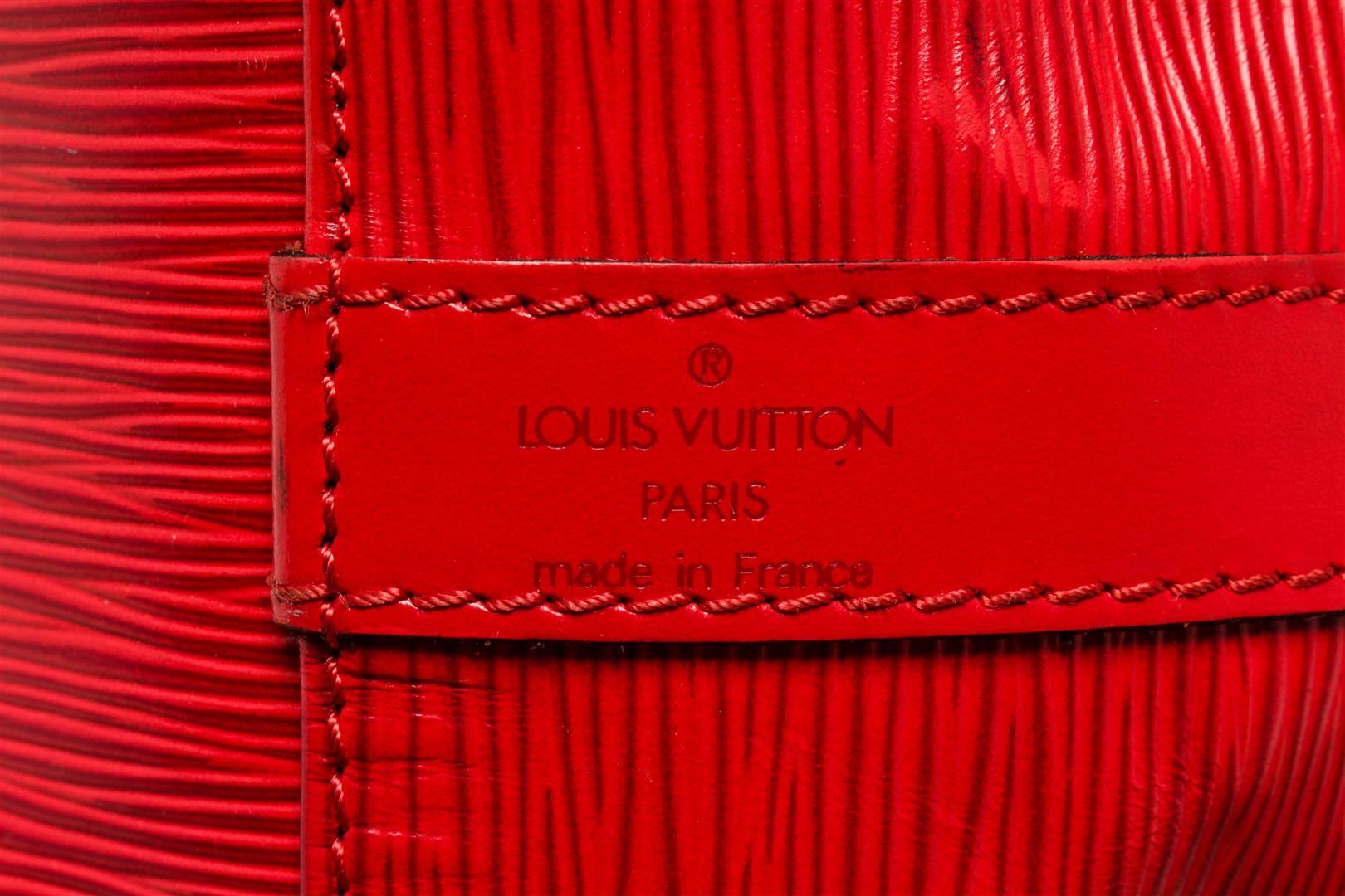 One Louis Vuitton Red Epi Leather Noe PM Bag. Item is sold AS-IS. All available information is listed in the description and shown in the photo. Louis Vuitton Red Epi Leather Petit Noe Bag with gold-tone hardware, red leather trim, red suede lining, single adjustable leather shoulder strap, and drawstring closure. .