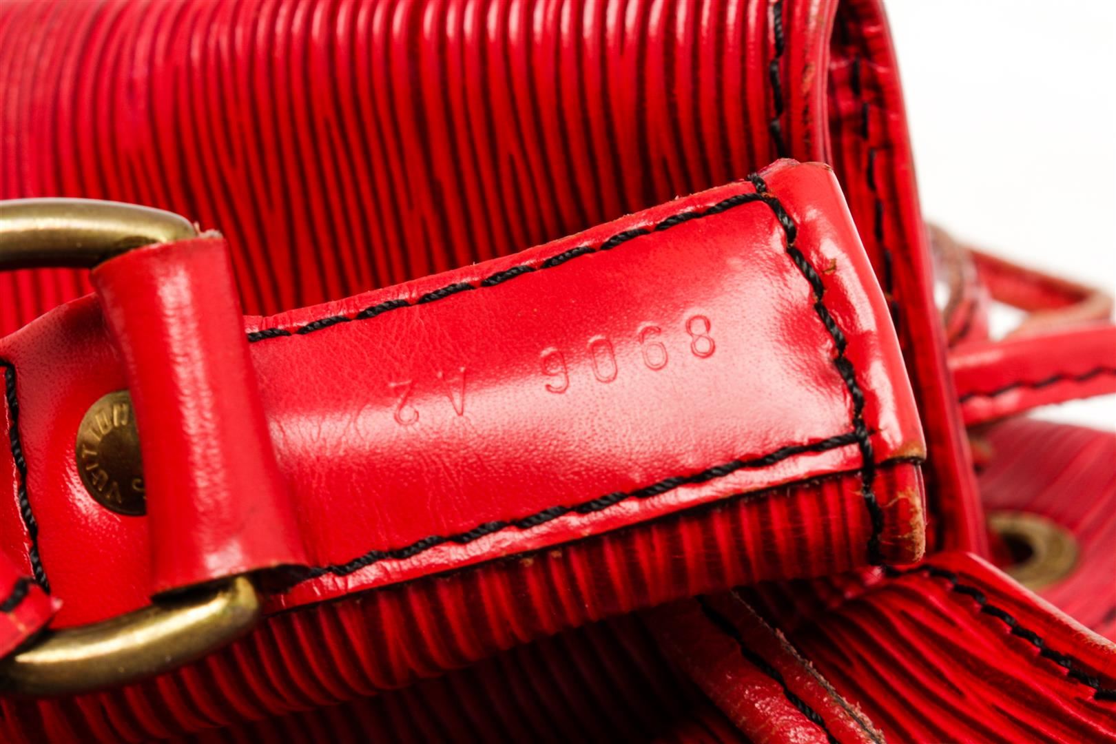 Louis Vuitton Red Epi Leather Noe Shoulder Bag. All available information is listed in the description and shown in the photos. Louis Vuitton Red Epi Leather Noe Shoulder Bag with red epi leather, printed, gold-tone hardware, single adjustable shoulder strap, alcantara lining, drawstring closure at top. Height: 13.5" Width: 10.5" Depth: 7.25" Shoulder Strap Drop: 8.5" / Height: 34.29 cm Width: 26.67 cm Depth: 18.41 cm Shoulder Strap Drop: 21.59 cm