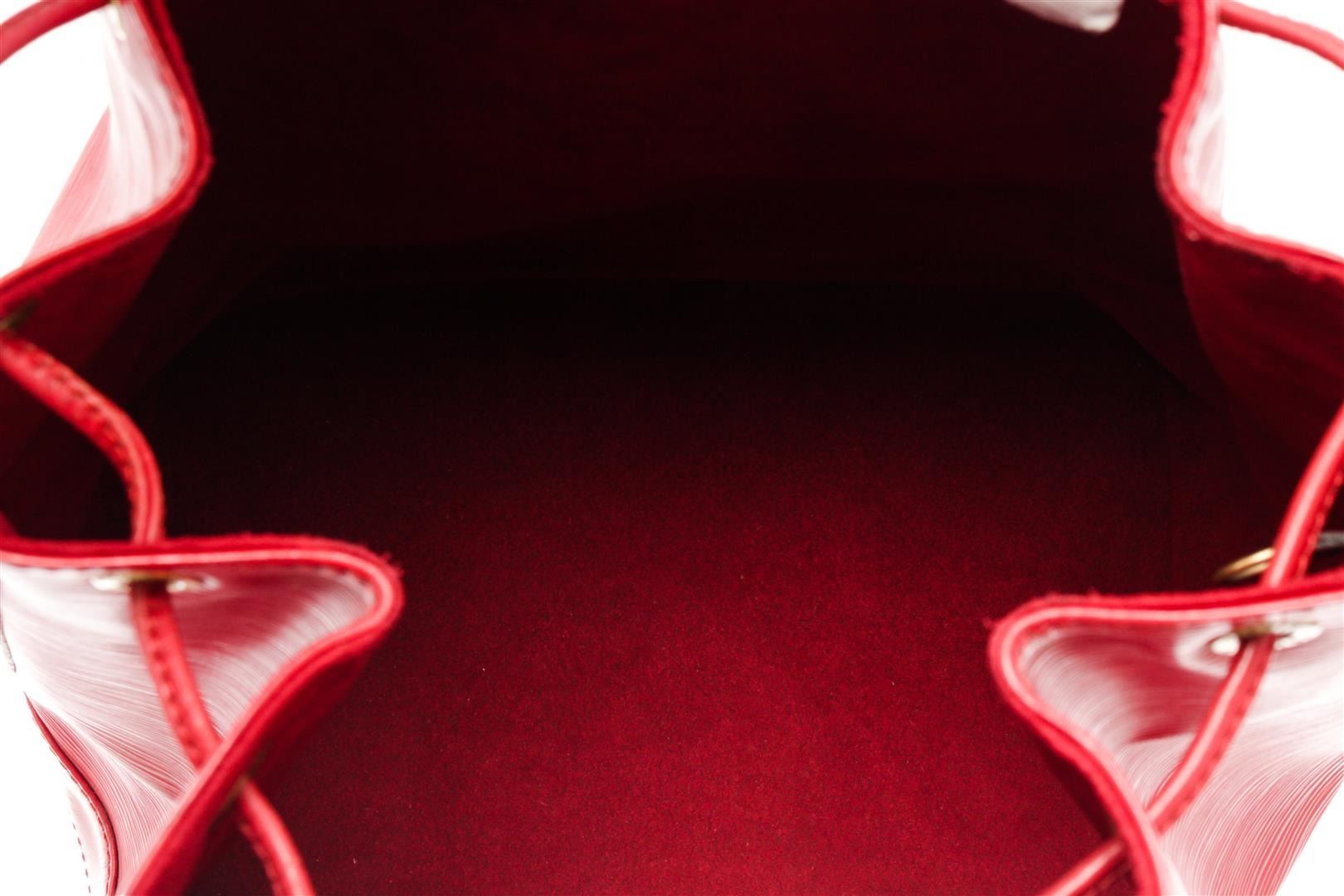 Louis Vuitton Red Epi Leather Noe Shoulder Bag. All available information is listed in the description and shown in the photos. Louis Vuitton Red Epi Leather Noe Shoulder Bag with red epi leather, printed, gold-tone hardware, single adjustable shoulder strap, alcantara lining, drawstring closure at top. Height: 13.5" Width: 10.5" Depth: 7.25" Shoulder Strap Drop: 8.5" / Height: 34.29 cm Width: 26.67 cm Depth: 18.41 cm Shoulder Strap Drop: 21.59 cm