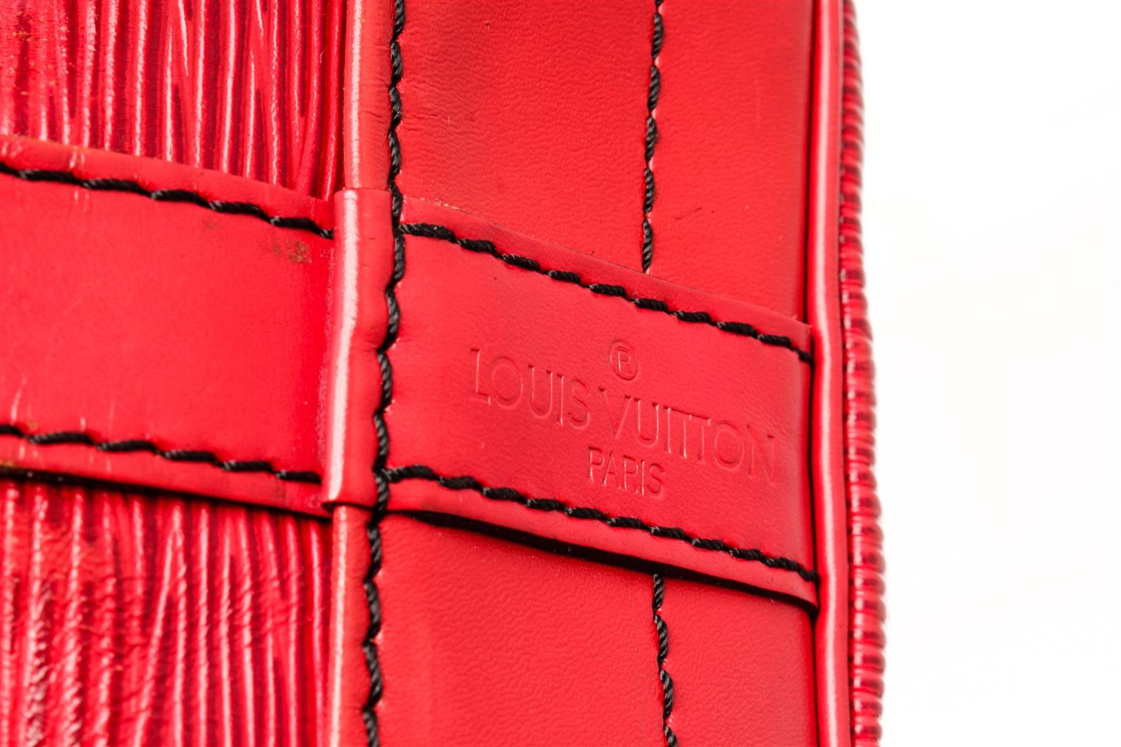 Louis Vuitton Red Epi Leather Noe Shoulder Bag. All available information is listed in the description and shown in the photos. Louis Vuitton Red Epi Leather Noe Shoulder Bag with red epi leather, printed, gold-tone hardware, single adjustable shoulder strap, alcantara lining, drawstring closure at top. Height: 13.5" Width: 10.5" Depth: 7.25" Shoulder Strap Drop: 8.5" / Height: 34.29 cm Width: 26.67 cm Depth: 18.41 cm Shoulder Strap Drop: 21.59 cm