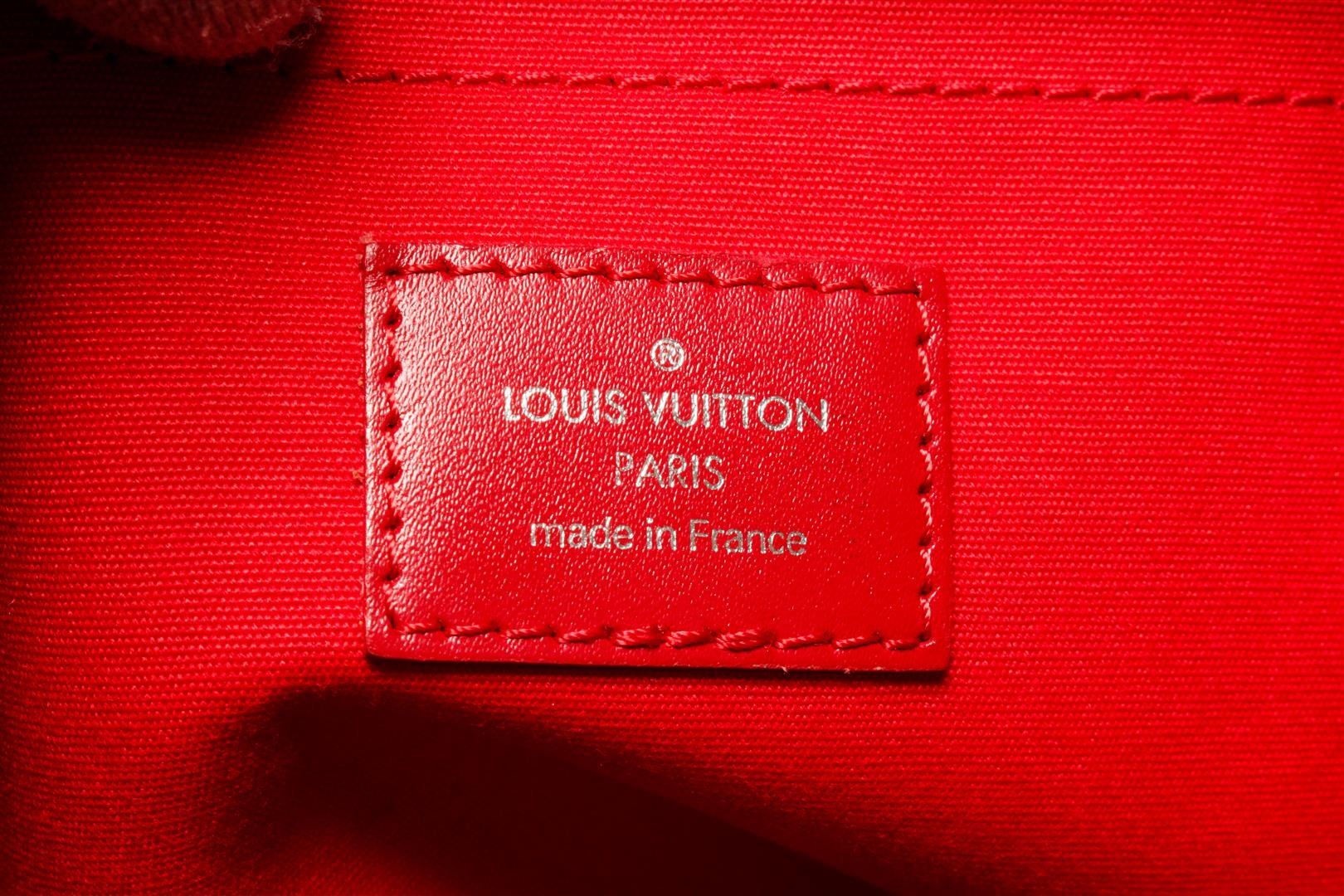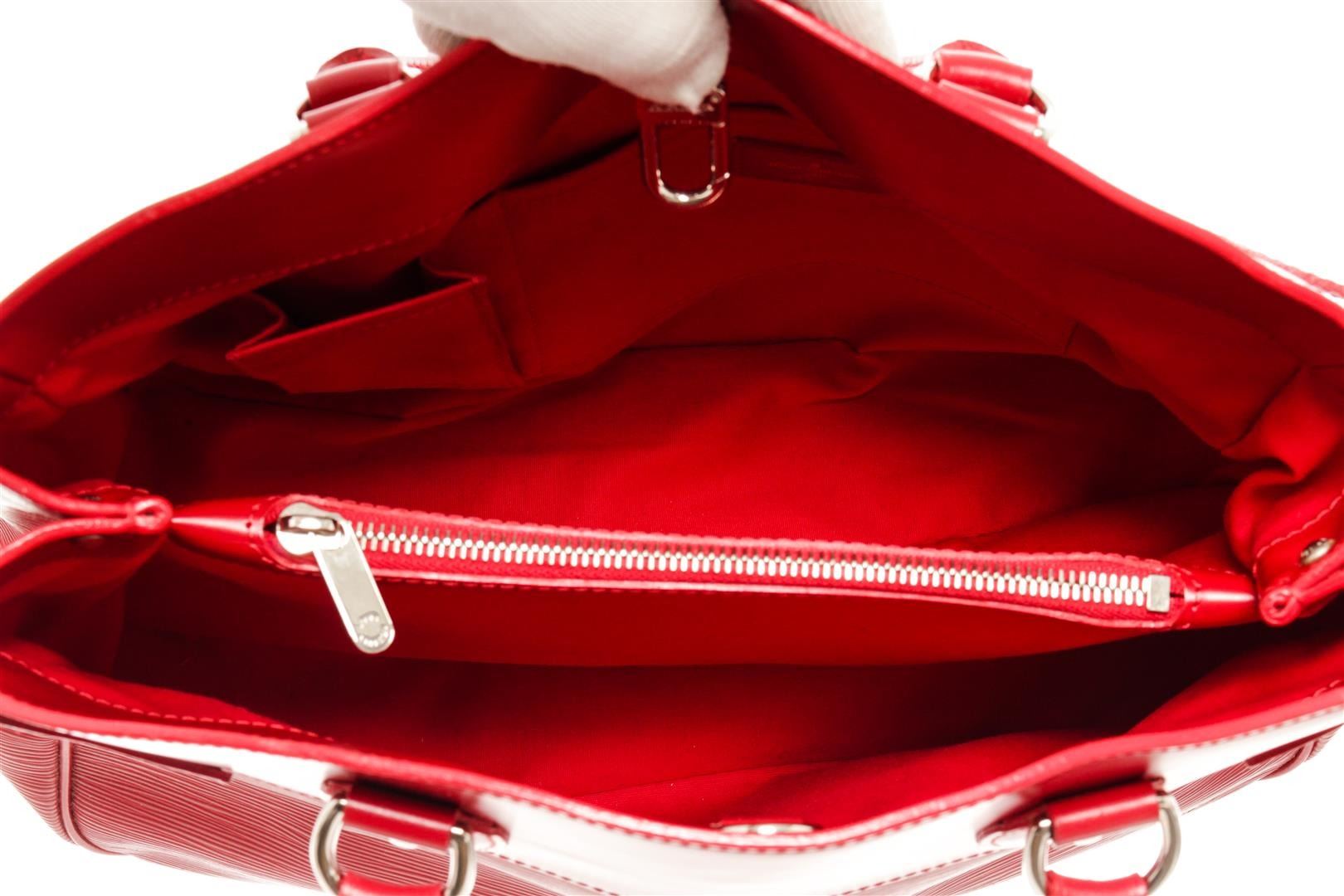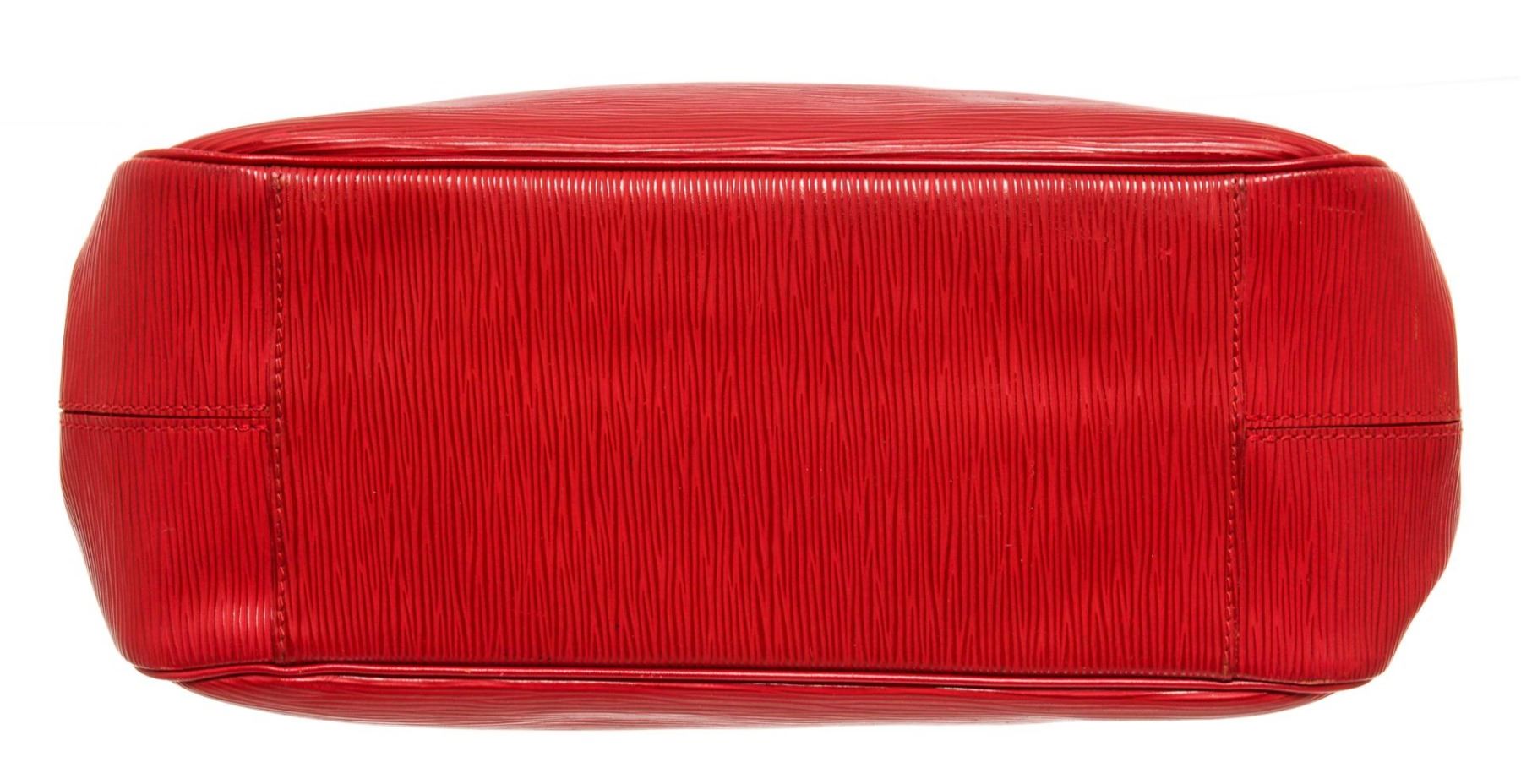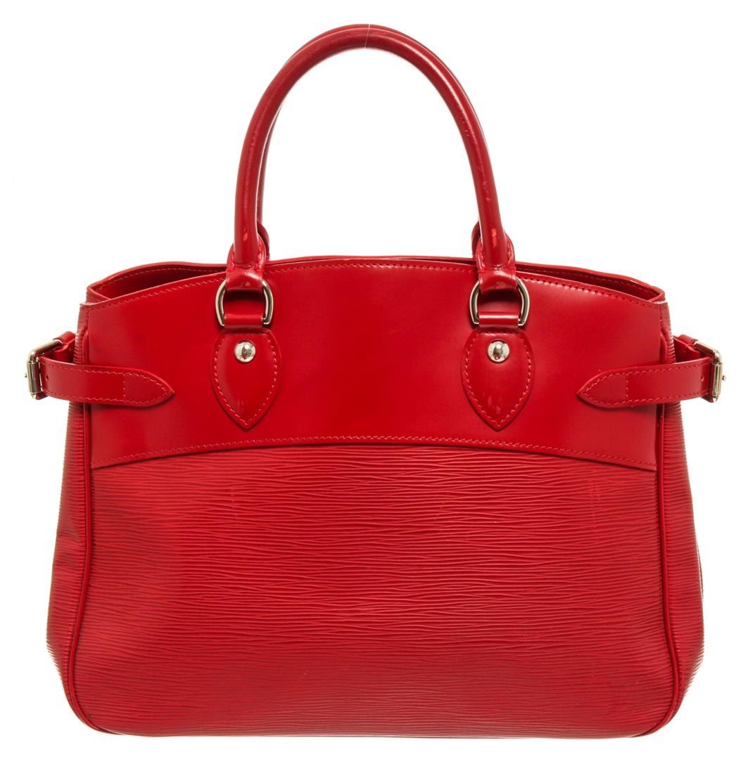 One Louis Vuitton Red Epi Leather Passy Handbag. Item is sold AS-IS. All available information is listed in the description and shown in the photo. Louis Vuitton Red Epi Leather Passy with top handle, silver tone hardware, red leather trim, interior zipper pocket, two slip pockets, fabric lining, dual rolled leather top handles, and snap closure. .