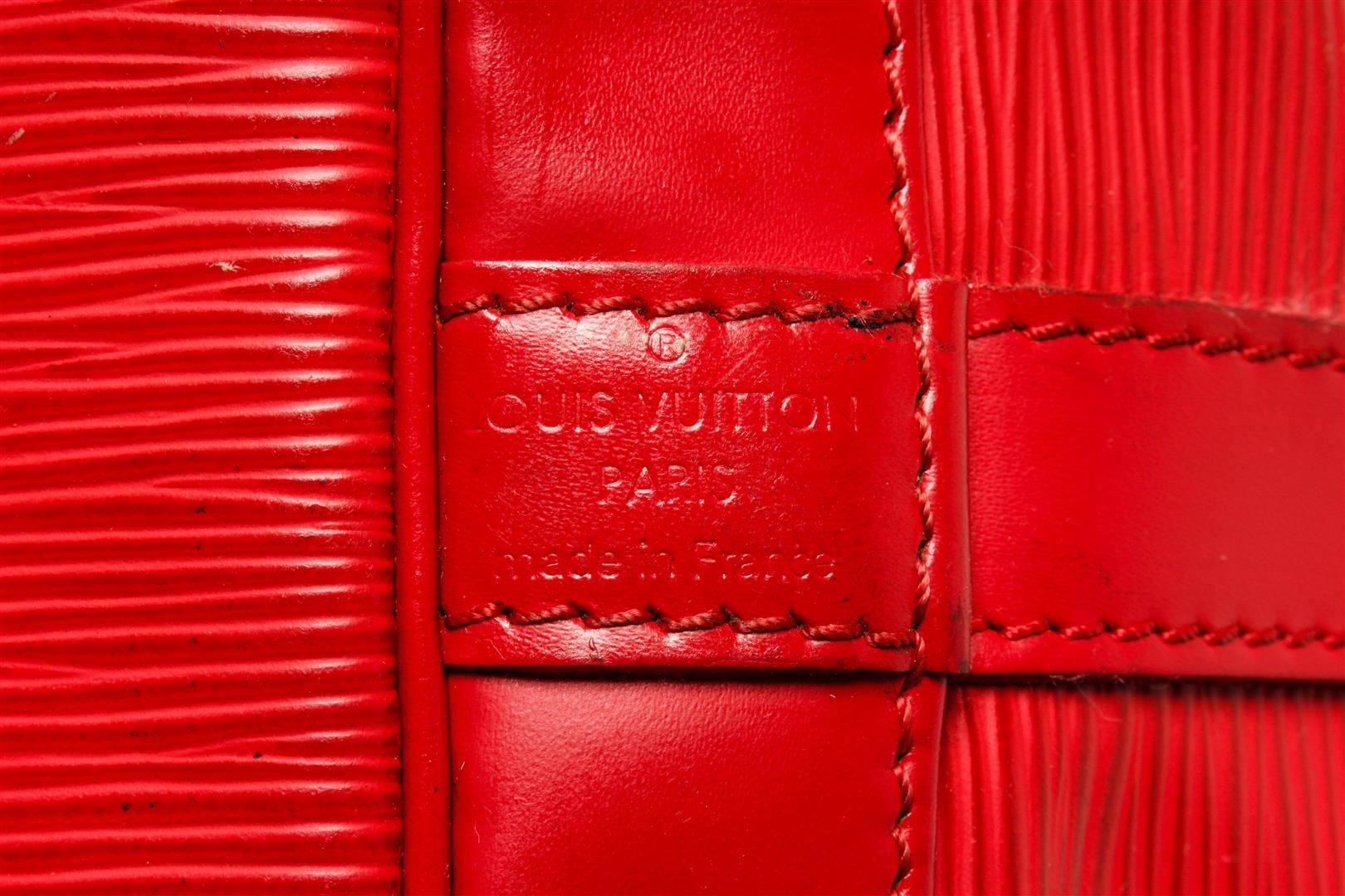 One Louis Vuitton Red Epi Leather Petit Noe Bag. Item is sold AS-IS. All available information is listed in the description and shown in the photo. Louis Vuitton Red Epi Leather Petit Noe Bag with silver-tone hardware, red leather trim, red suede lining, single adjustable leather shoulder strap, and drawstring closure. .