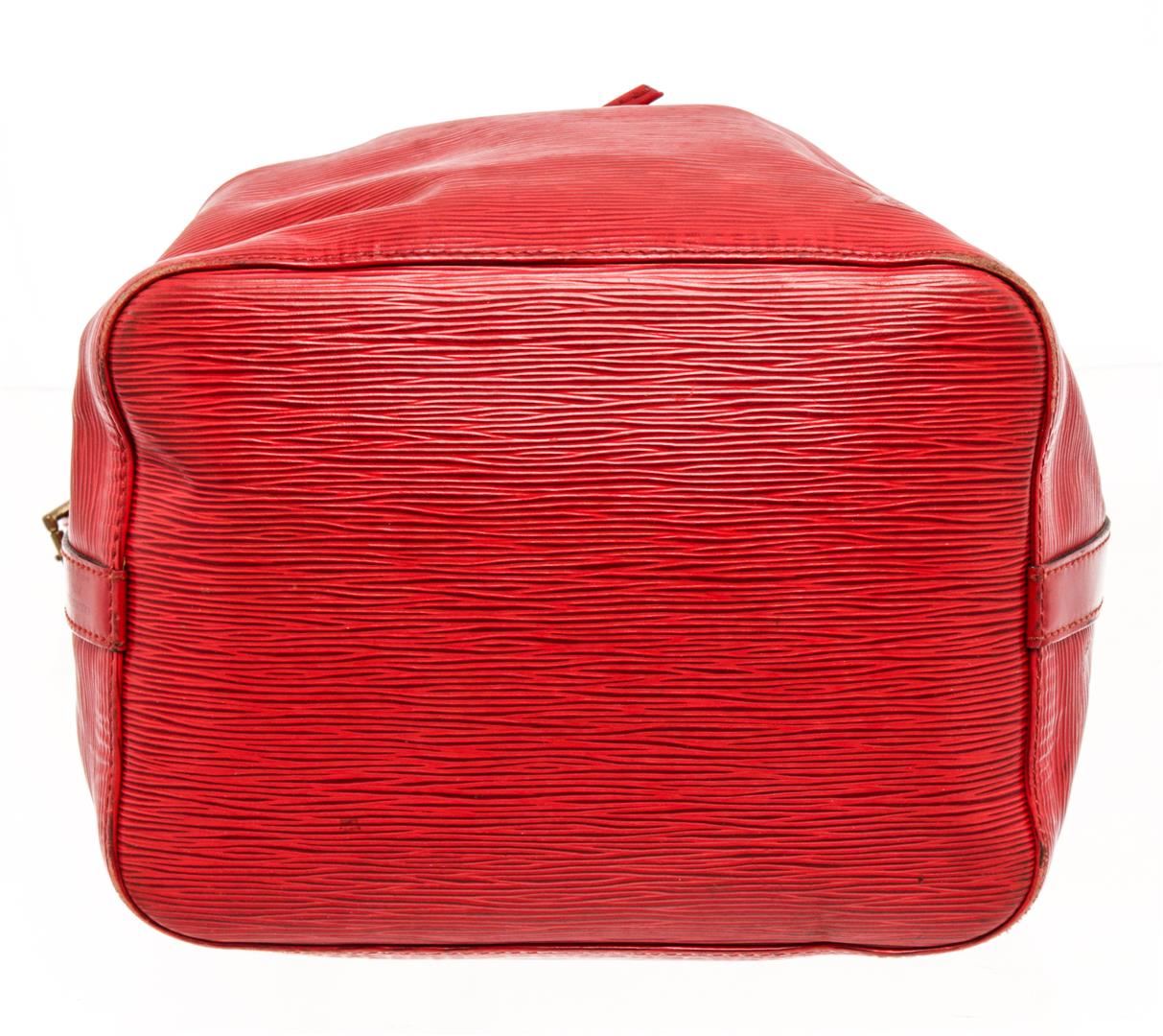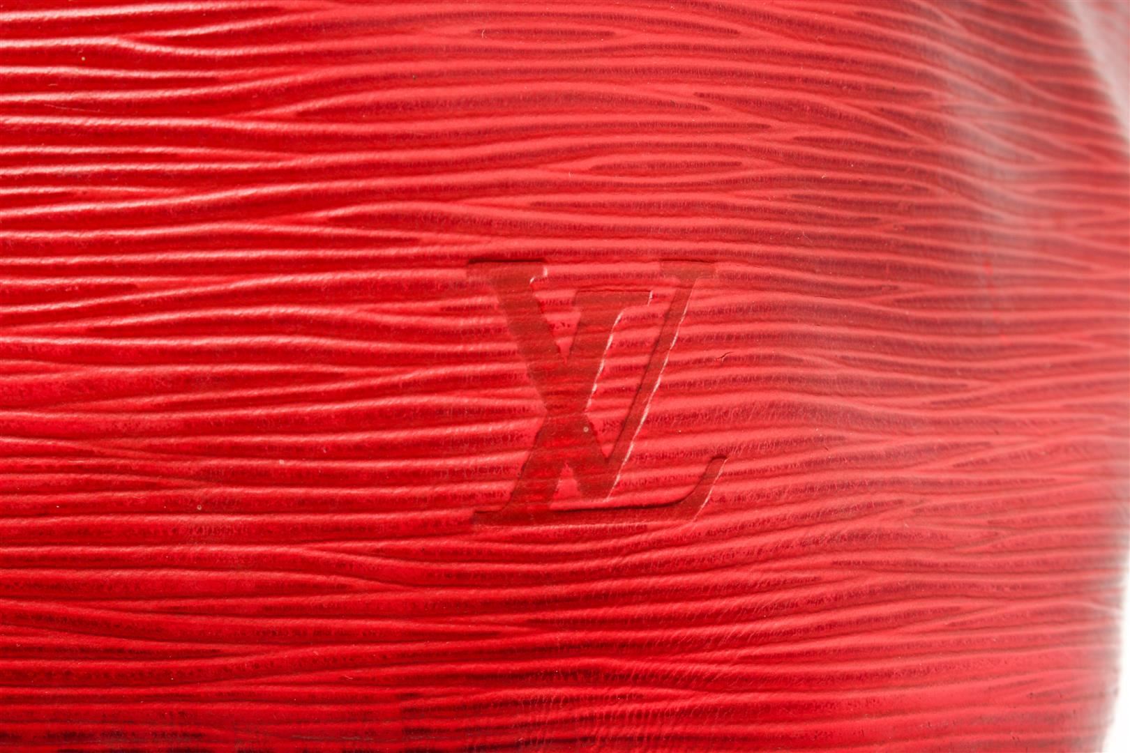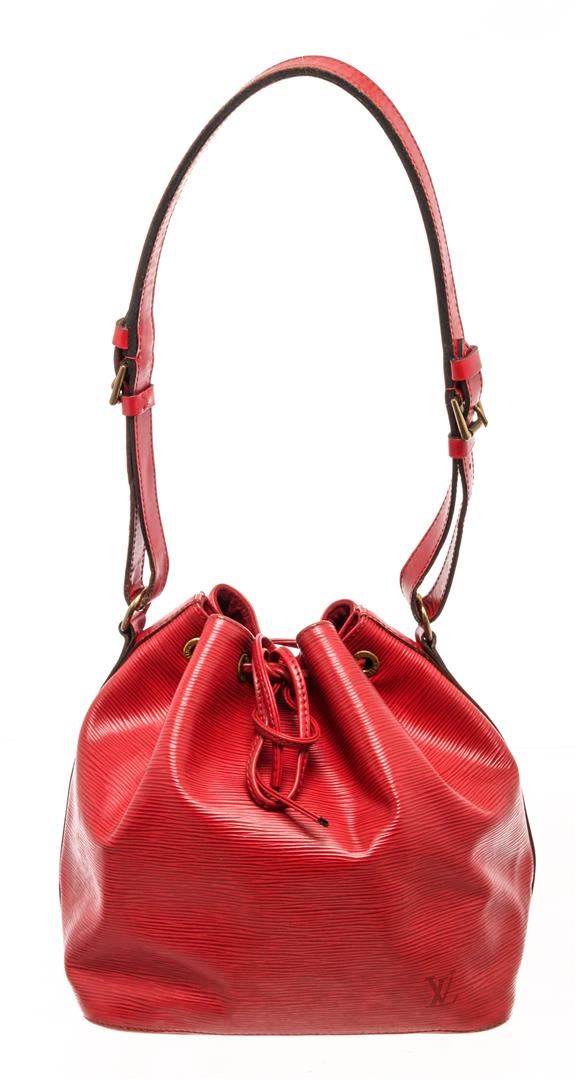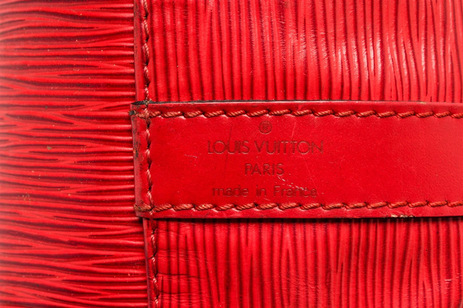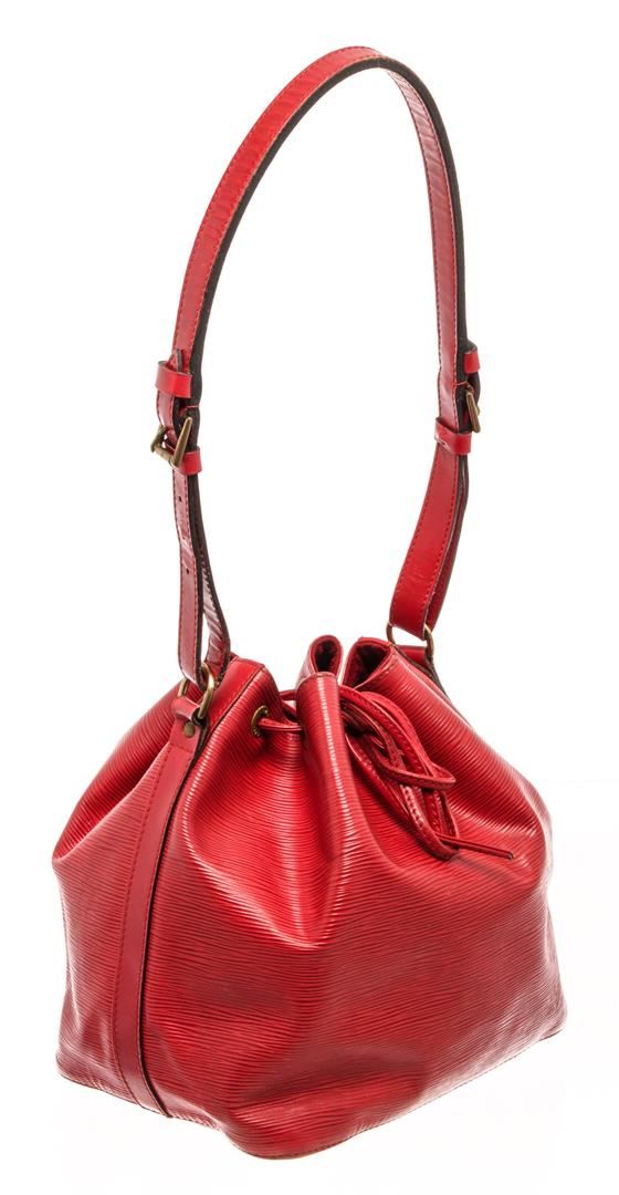 Louis Vuitton Red Epi Leather Petit Noe Shoulder Bag. All available information is listed in the description and shown in the photos. Louis Vuitton Red Epi Leather Petit Noe Shoulder Bag with red epi leather, brass hardware, single adjustable shoulder strap, alcantara lining, drawstring closure at top. Height: 10" Width: 15.5" Depth: 7" Shoulder Strap Drop: 9" / Height: 25.4" Width: 39.37" Depth: 17.78" Shoulder Strap Drop: 22.86"