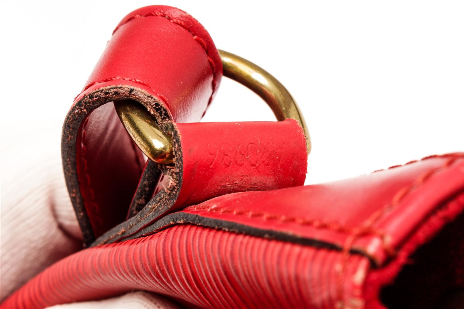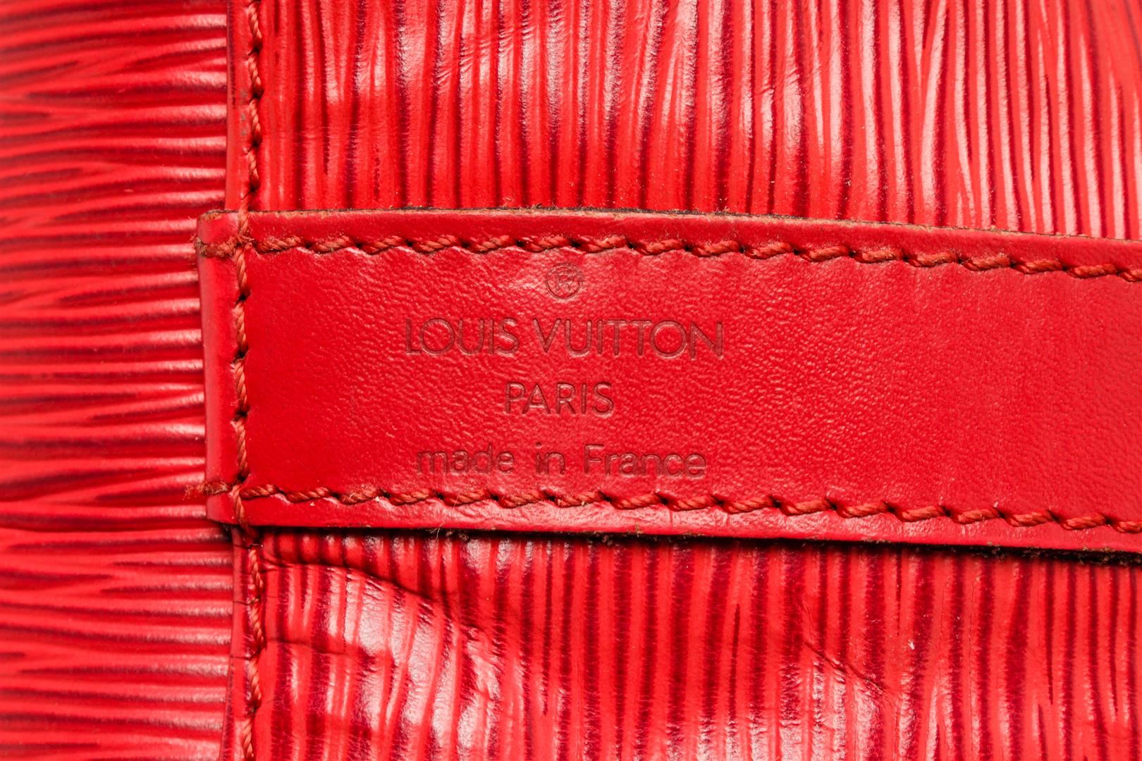 Louis Vuitton Red Epi Leather Petit Noe Shoulder Bag. All available information is listed in the description and shown in the photos. Louis Vuitton Red Epi Leather Petit Noe Shoulder Bag with red epi leather, brass hardware, single adjustable shoulder strap, alcantara lining, drawstring closure at top. Height: 10" Width: 15.5" Depth: 7" Shoulder Strap Drop: 9" / Height: 25.4" Width: 39.37" Depth: 17.78" Shoulder Strap Drop: 22.86"