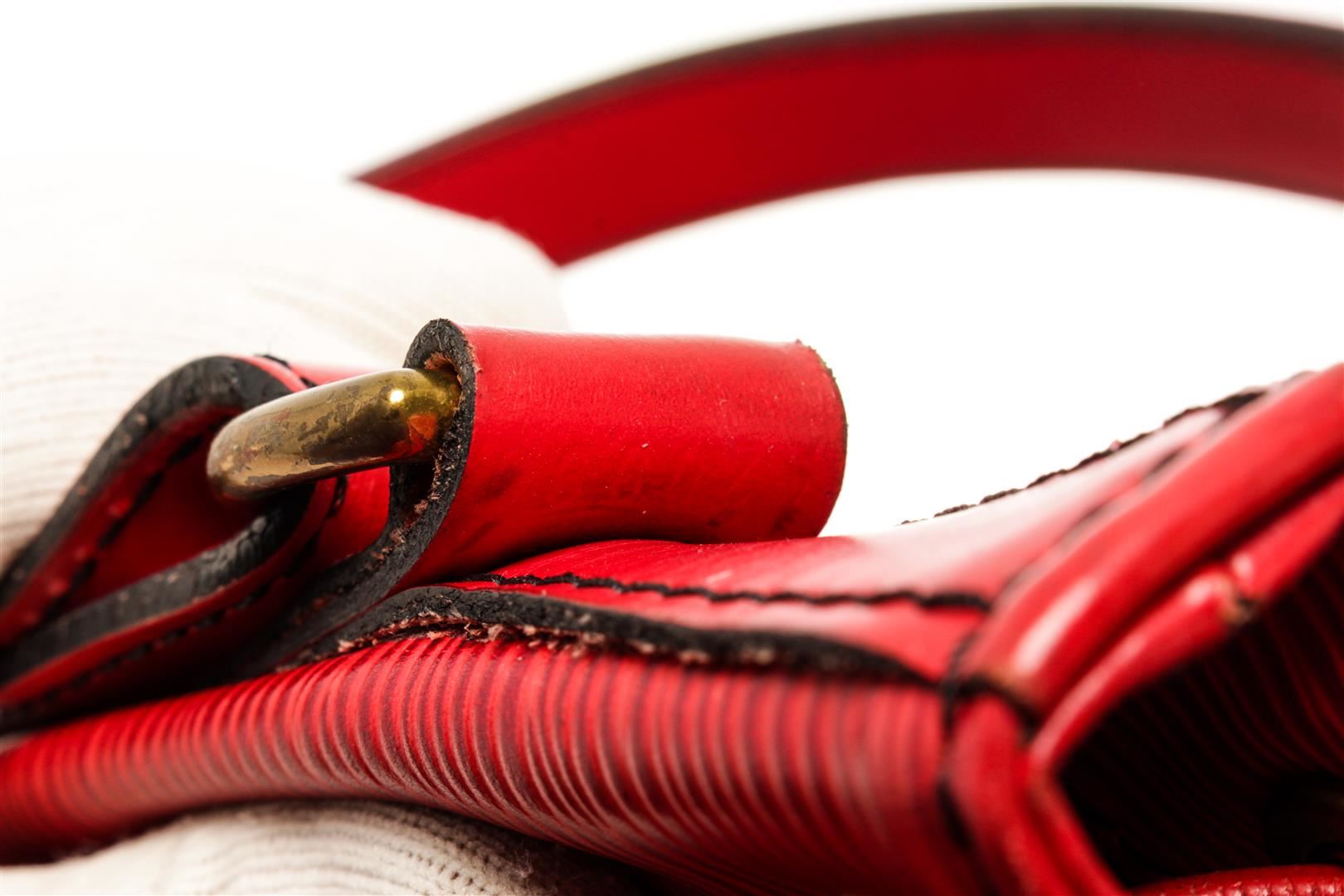 One Louis Vuitton Red Epi Leather Petit Noe Shoulder Bag. Item is sold AS-IS. All available information is listed in the description and shown in the photo. louis vuitton red epi leather petit noe shoulder bag 28cm x 23cm x 17.5cm / 11.02" x 9.05" x 6.88" Inches