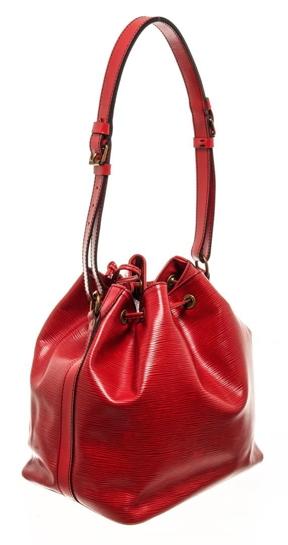 One Louis Vuitton Red Epi Leather Petit Noe Shoulder Bag. Item is sold AS-IS. All available information is listed in the description and shown in the photo. louis vuitton red epi leather petit noe shoulder bag 28cm x 23cm x 17.5cm / 11.02" x 9.05" x 6.88" Inches