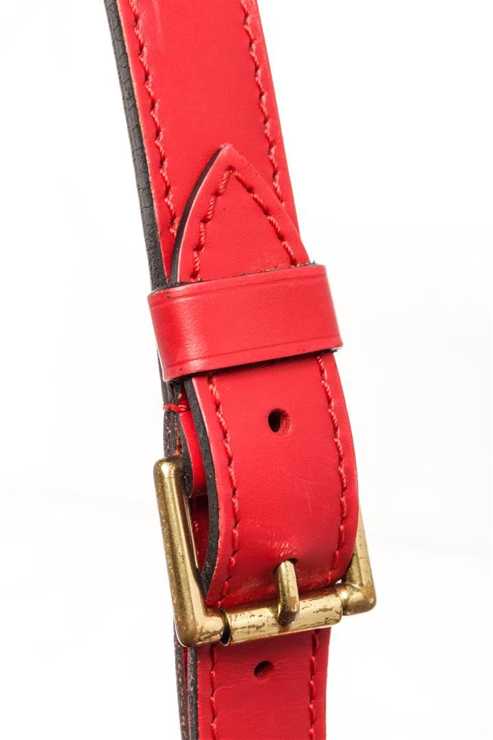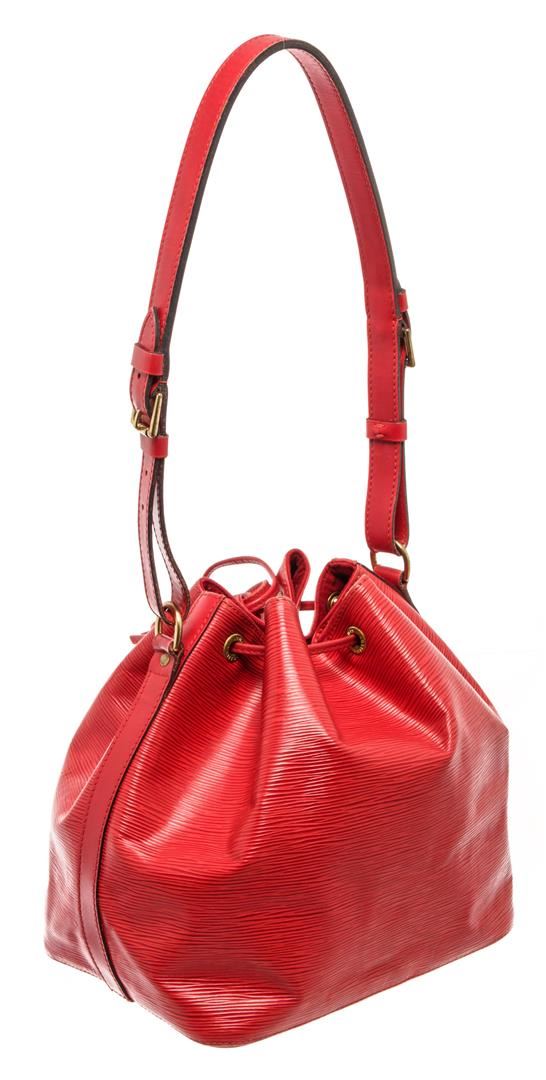 Louis Vuitton Red Epi Leather Petit Noe Shoulder Bag. All available information is listed in the description and shown in the photos. Louis Vuitton Red Epi Leather Petit Noe Shoulder Bag with red epi leather, brass hardware, single adjustable shoulder strap, alcantara lining, drawstring closure at top. Height: 10" Width: 15.5" Depth: 7" Shoulder Strap Drop: 9" / Height: 25.4" Width: 39.37" Depth: 17.78" Shoulder Strap Drop: 22.86"