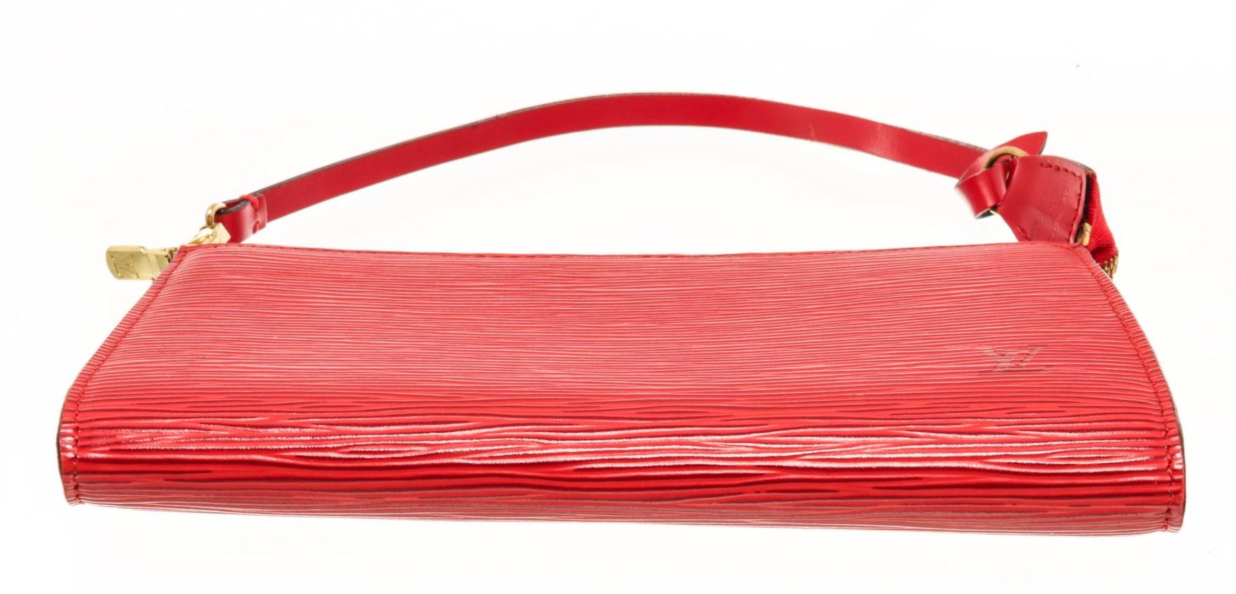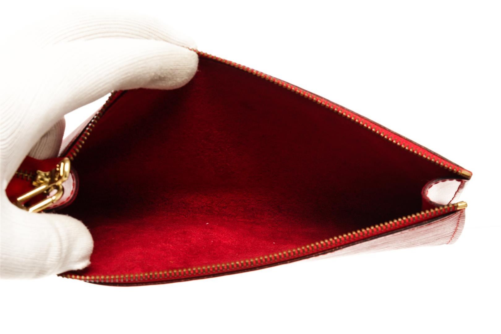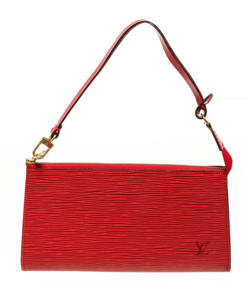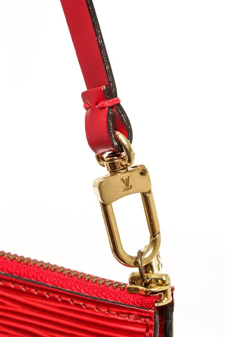 One Louis Vuitton Red Epi Leather Pochette. Item is sold AS-IS. All available information is listed in the description and shown in the photo. Louis Vuitton red epi leather pochette with red suede lining, embossed logo on the exterior, gold-tone hardware, zipper closure, top handle with a hook (can be worn as a wristlet), and one main compartment.