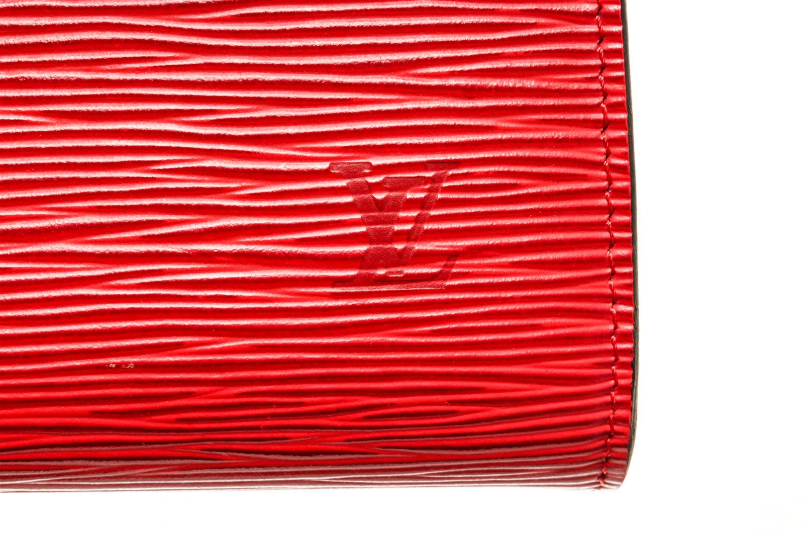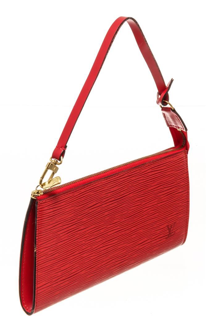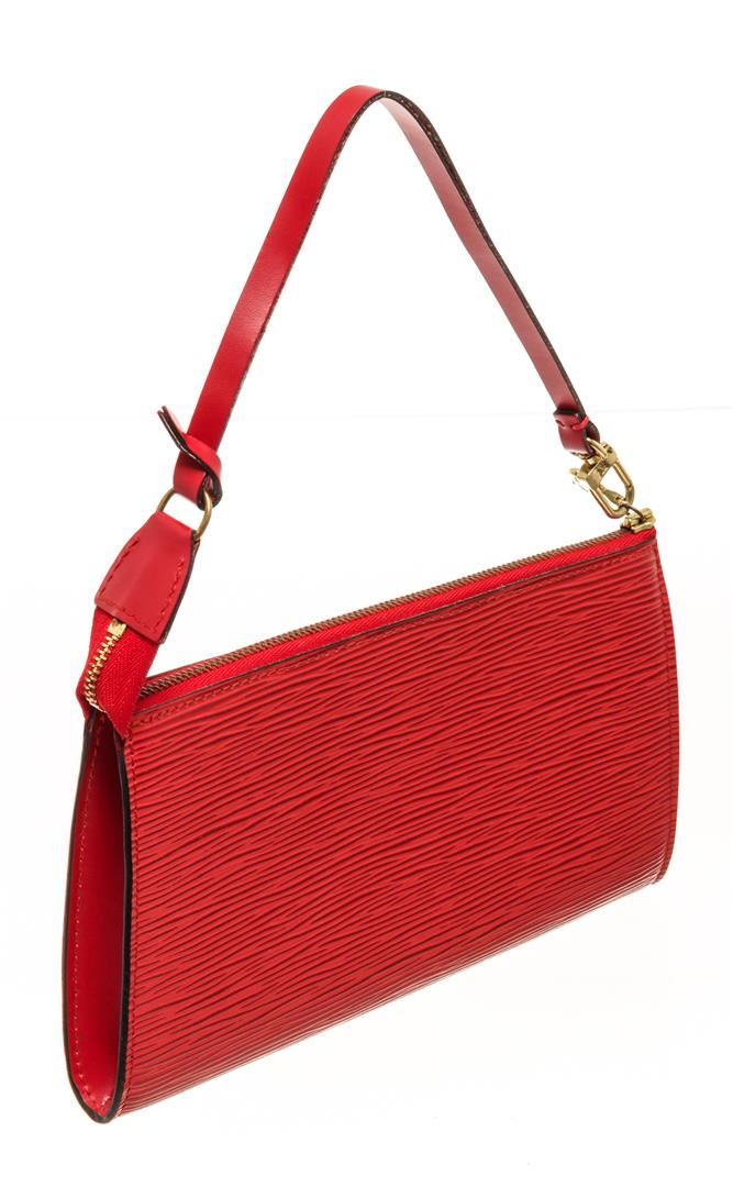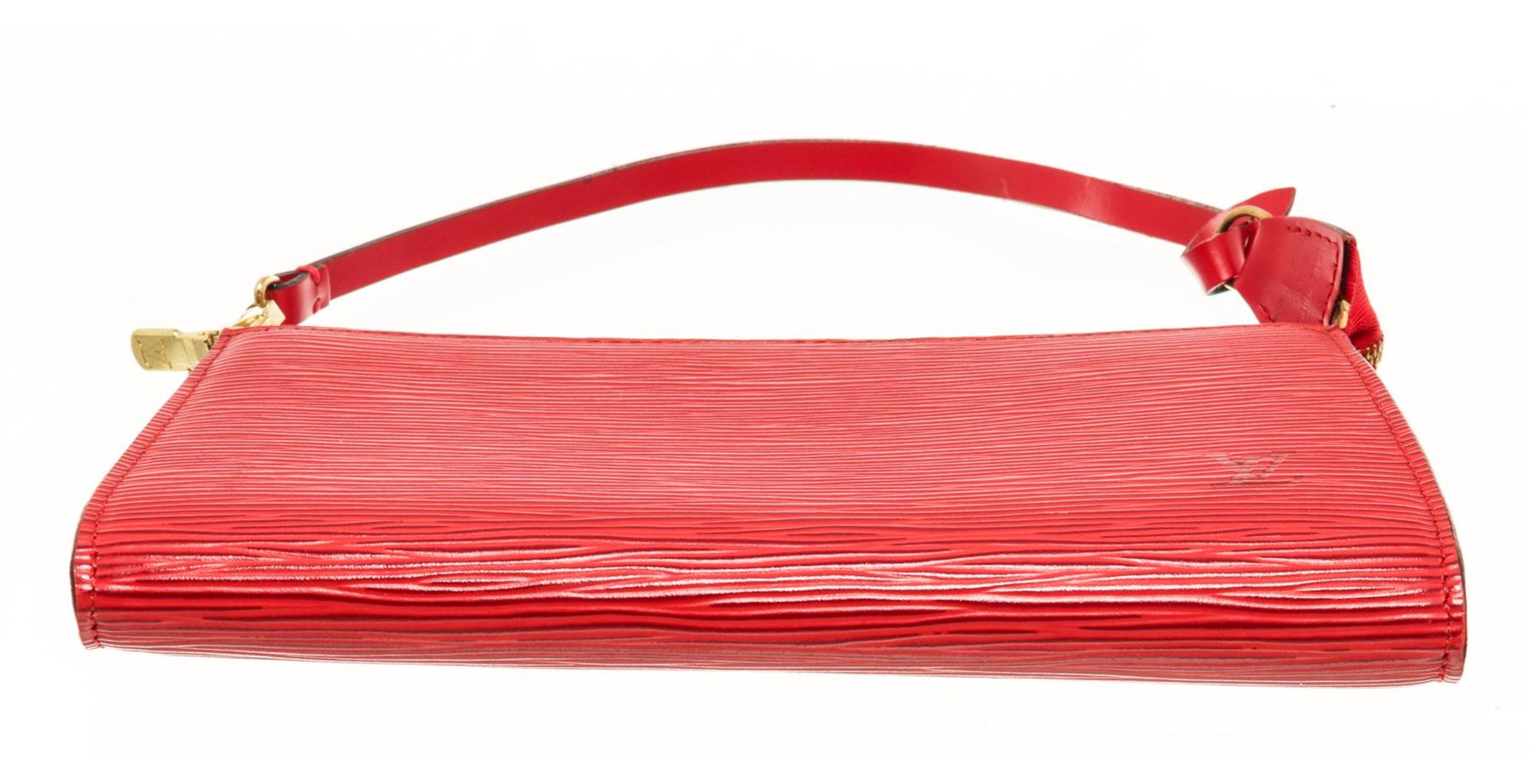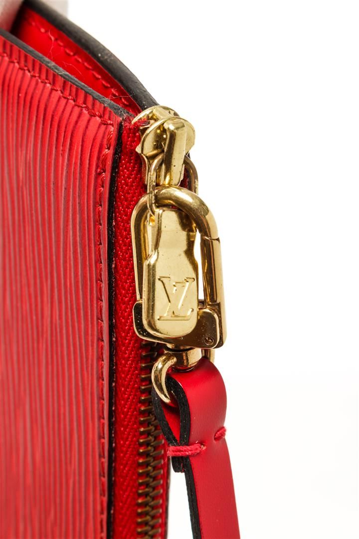 One Louis Vuitton Red Epi Leather Pochette. Item is sold AS-IS. All available information is listed in the description and shown in the photo. Louis Vuitton red epi leather pochette with red suede lining, embossed logo on the exterior, gold-tone hardware, zipper closure, top handle with a hook (can be worn as a wristlet), and one main compartment.