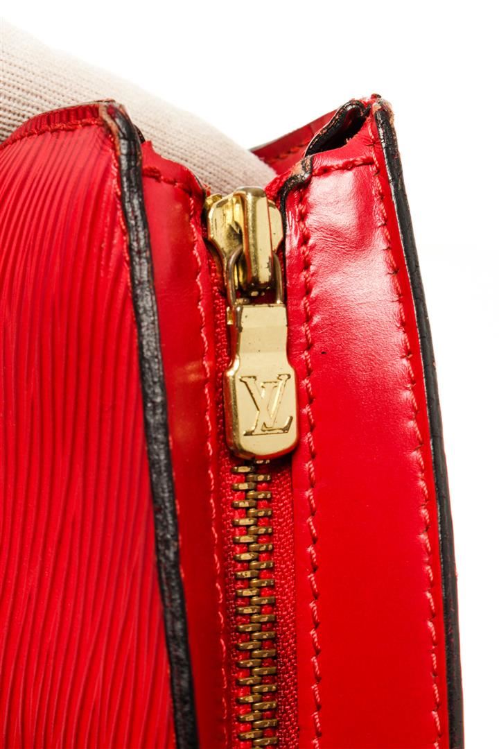 One Louis Vuitton Red Epi Leather Saint Jacques Shoulder Bag. Item is sold AS-IS. All available information is listed in the description and shown in the photo. louis vuitton red epi leather saint jacques shoulder bag with gold-tone hardware, debossed logo to the front, top zip fastening, two long top handles, internal jetted pocket, internal logo patch, leather lining, Depth 6.7 in, Height 11.8 in, Strap 9.4 in, Width c in / Depth 17 cm, Height 30 cm, Strap 24 cm, Width 26 cm