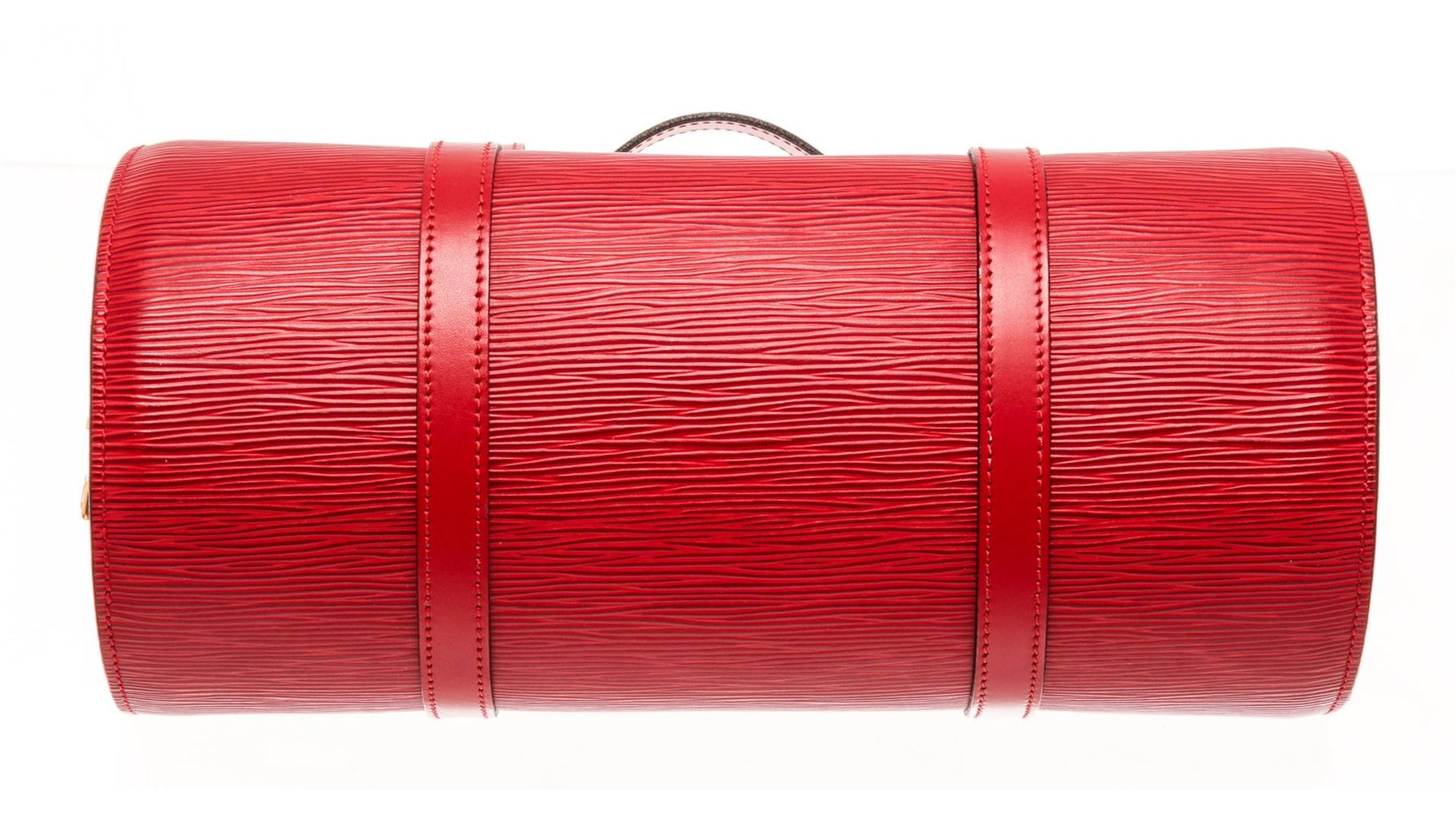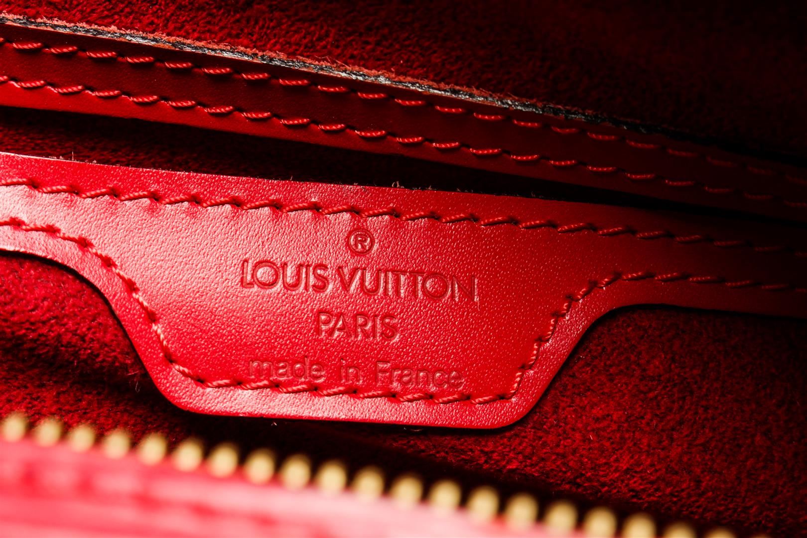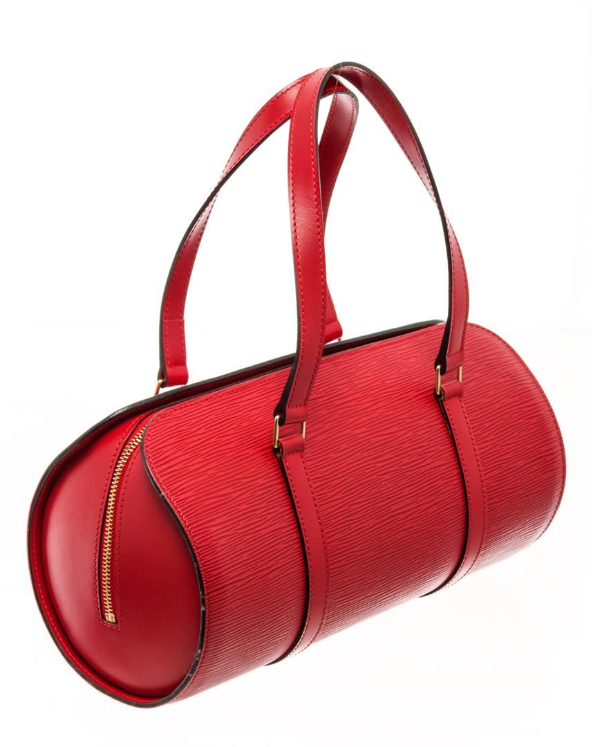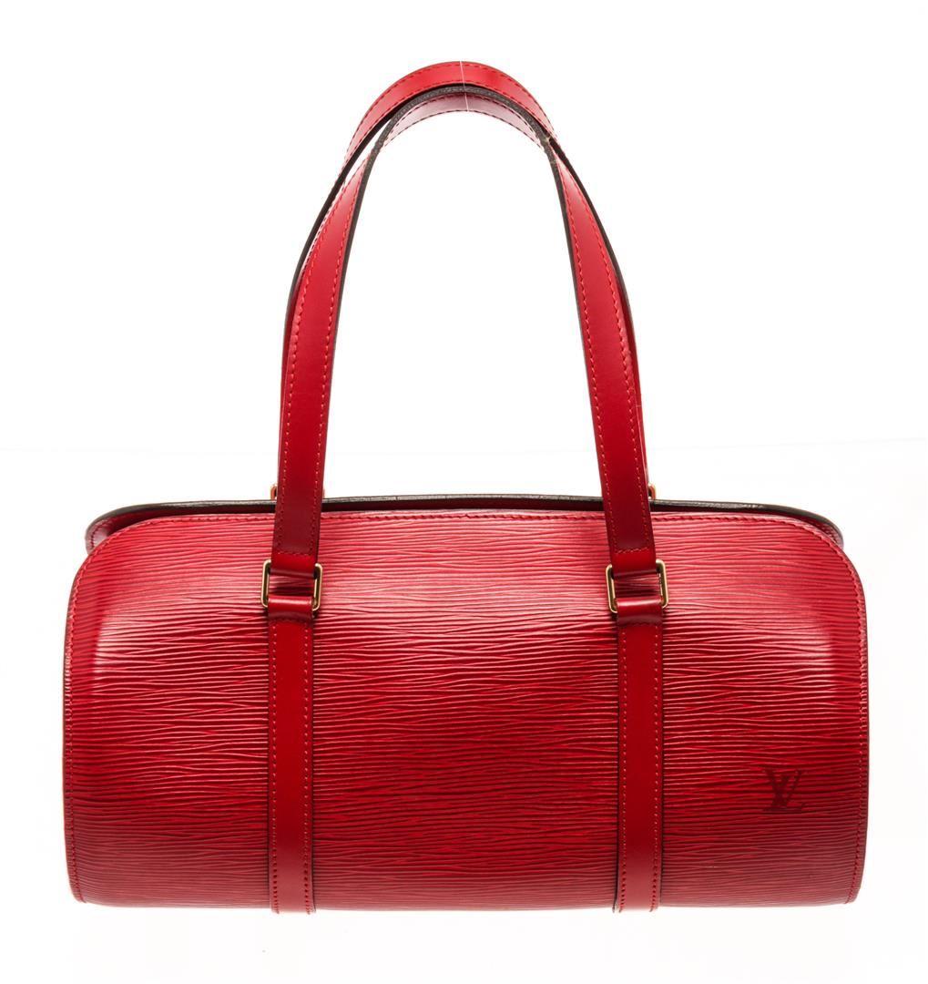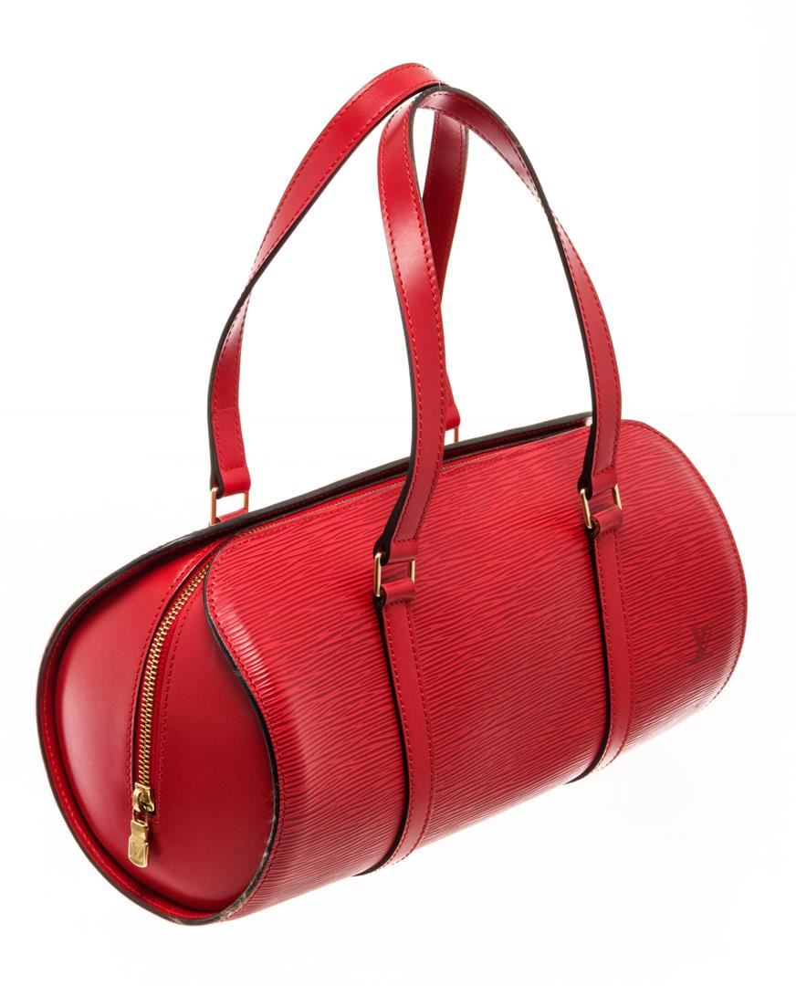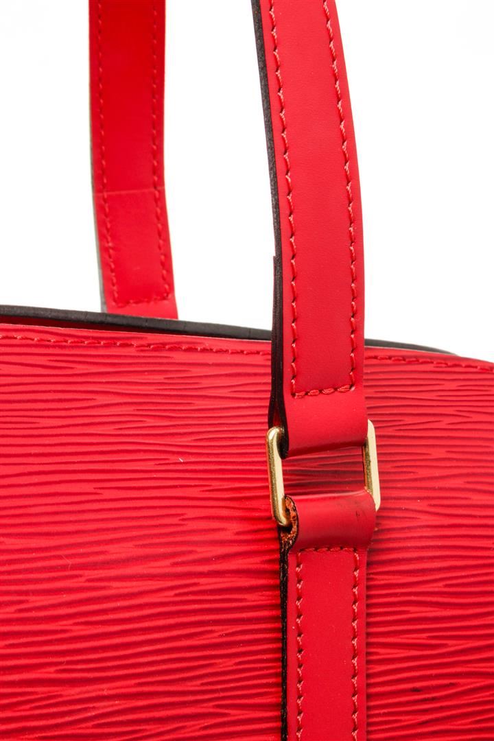 One Louis Vuitton Red Epi Leather Soufflot Tote Bag. Item is sold AS-IS. All available information is listed in the description and shown in the photo. Louis Vuitton Red Epi Leather Soufflot Tote Bag with top handle, suede lining, interior pocket, gold tone hardware, zip closure. Depth 5.5 in, Height 5.9 in, Width 12.2 in, Handle 6.7 in/ Depth 14 cm, Height 15 cm, Width 31 cm, Handle 17 cm