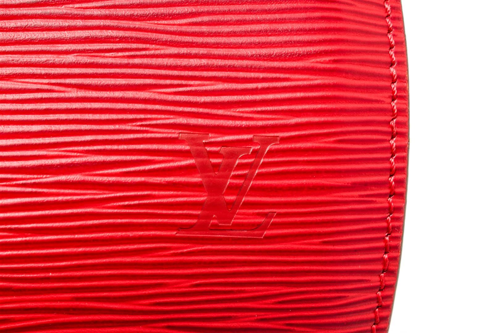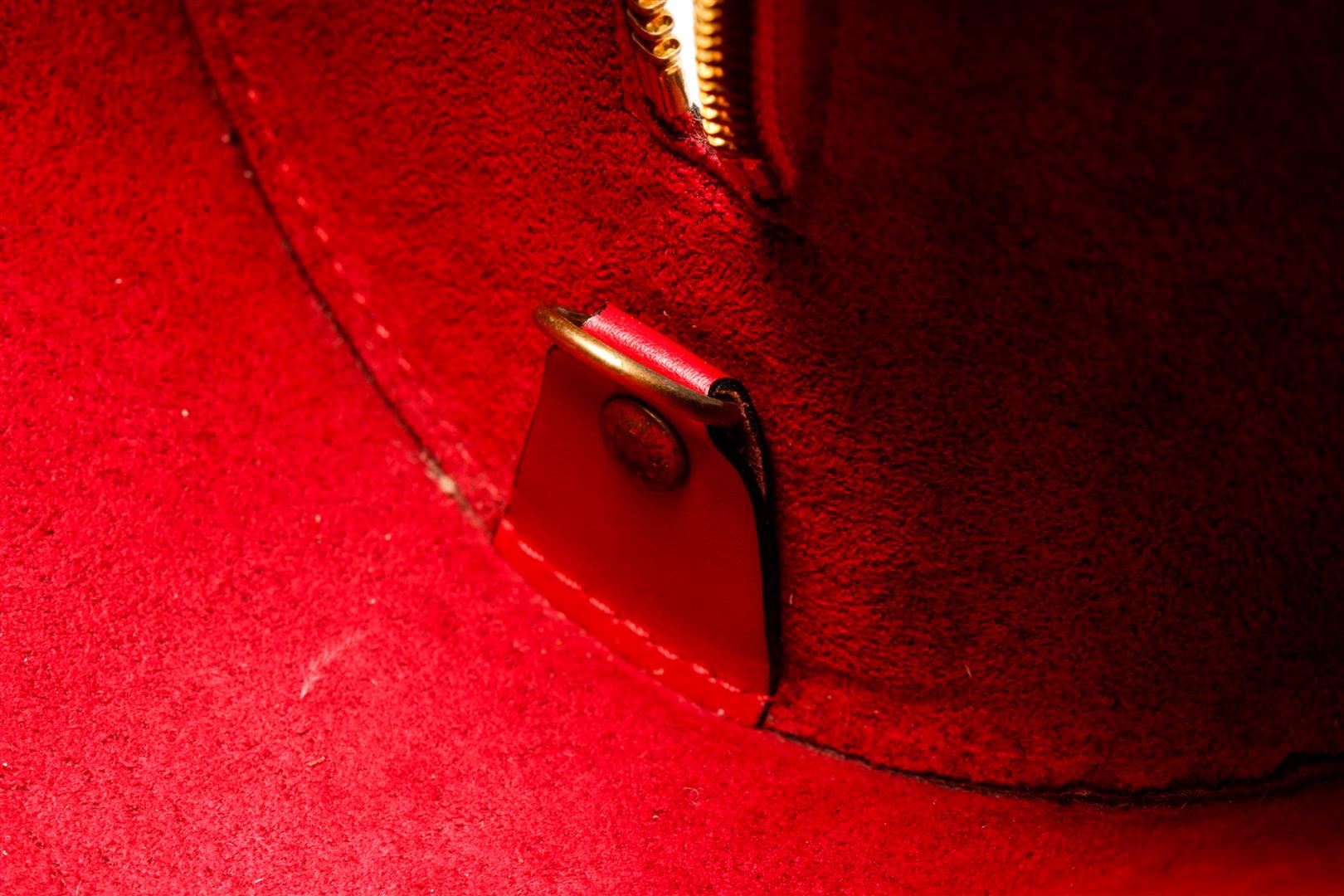 One Louis Vuitton Red Epi Leather Soufflot Tote Bag. Item is sold AS-IS. All available information is listed in the description and shown in the photo. Louis Vuitton Red Epi Leather Soufflot Tote Bag with top handle, suede lining, interior pocket, gold tone hardware, zip closure. Depth 5.5 in, Height 5.9 in, Width 12.2 in, Handle 6.7 in/ Depth 14 cm, Height 15 cm, Width 31 cm, Handle 17 cm
