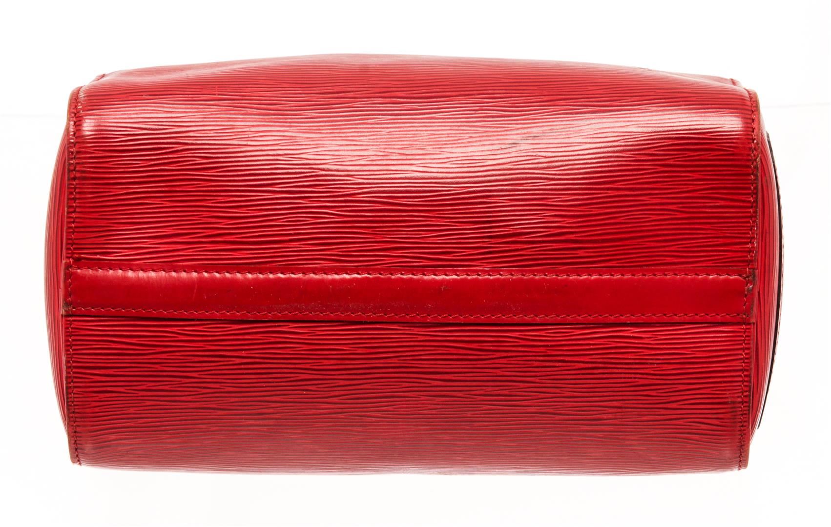 One Louis Vuitton Red Epi Leather Speedy 25 Satchel Bag. Item is sold AS-IS. All available information is listed in the description and shown in the photo. Louis Vuitton Red Epi Leather Speedy 25 Satchel Bag with top handle, exterior side pocket, suede lining, interior slip pocket, gold tone hardware, zipper closure. There is stain on the suede lining, a scratch on the leather. Please refer to photos. Depth 5.9 in, Height 7.9 in, Width 11 in, Handle 3.1 in/ Depth 15 cm, Height 20 cm, Width 28 cm, Handle 8 cm