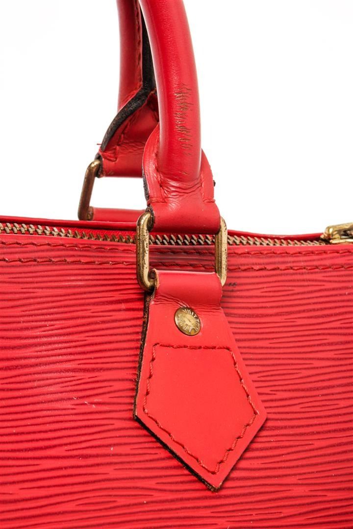 One Louis Vuitton Red Epi Leather Speedy 25 Satchel Bag. Item is sold AS-IS. All available information is listed in the description and shown in the photo. Louis Vuitton Red Epi Leather Speedy 25 Satchel Bag with top handle, exterior side pocket, suede lining, interior slip pocket, gold tone hardware, zipper closure. There is stain on the suede lining, a scratch on the leather. Please refer to photos. Depth 5.9 in, Height 7.9 in, Width 11 in, Handle 3.1 in/ Depth 15 cm, Height 20 cm, Width 28 cm, Handle 8 cm