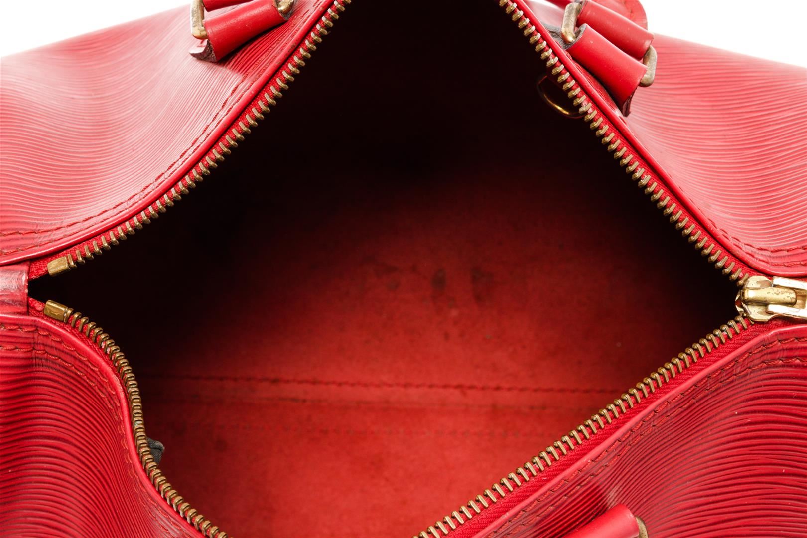 One Louis Vuitton Red Epi Leather Speedy 25 Satchel Bag. Item is sold AS-IS. All available information is listed in the description and shown in the photo. Louis Vuitton Red Epi Leather Speedy 25 Satchel Bag with top handle, exterior side pocket, suede lining, interior slip pocket, gold tone hardware, zipper closure. There is stain on the suede lining, a scratch on the leather. Please refer to photos. Depth 5.9 in, Height 7.9 in, Width 11 in, Handle 3.1 in/ Depth 15 cm, Height 20 cm, Width 28 cm, Handle 8 cm