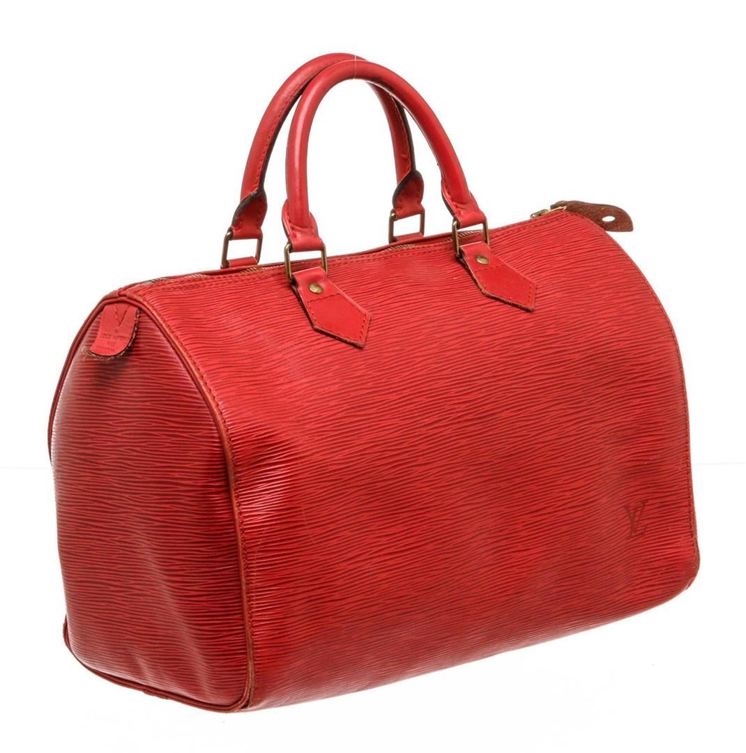 Red Epi leather Louis Vuitton Speedy 30 with brass hardware, dual rolled handles, embossed logo embellishment at front face, single slit pocket at exterior, tonal canvas lining, single slit pocket at interior wall and zip closure at top.