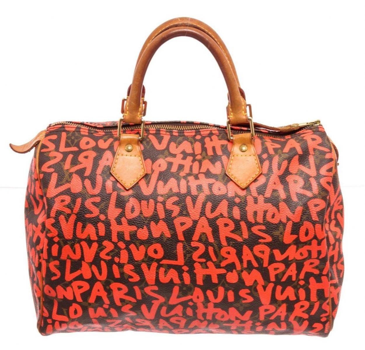 Louis Vuitton Red Graffiti Speedy 30cm Satchel Bag. Louis Vuitton Red Graffiti Speedy 30cm Satchel Bag with gold-tone hardware, trim tan vachetta leather, dual top handle and zipper closure.