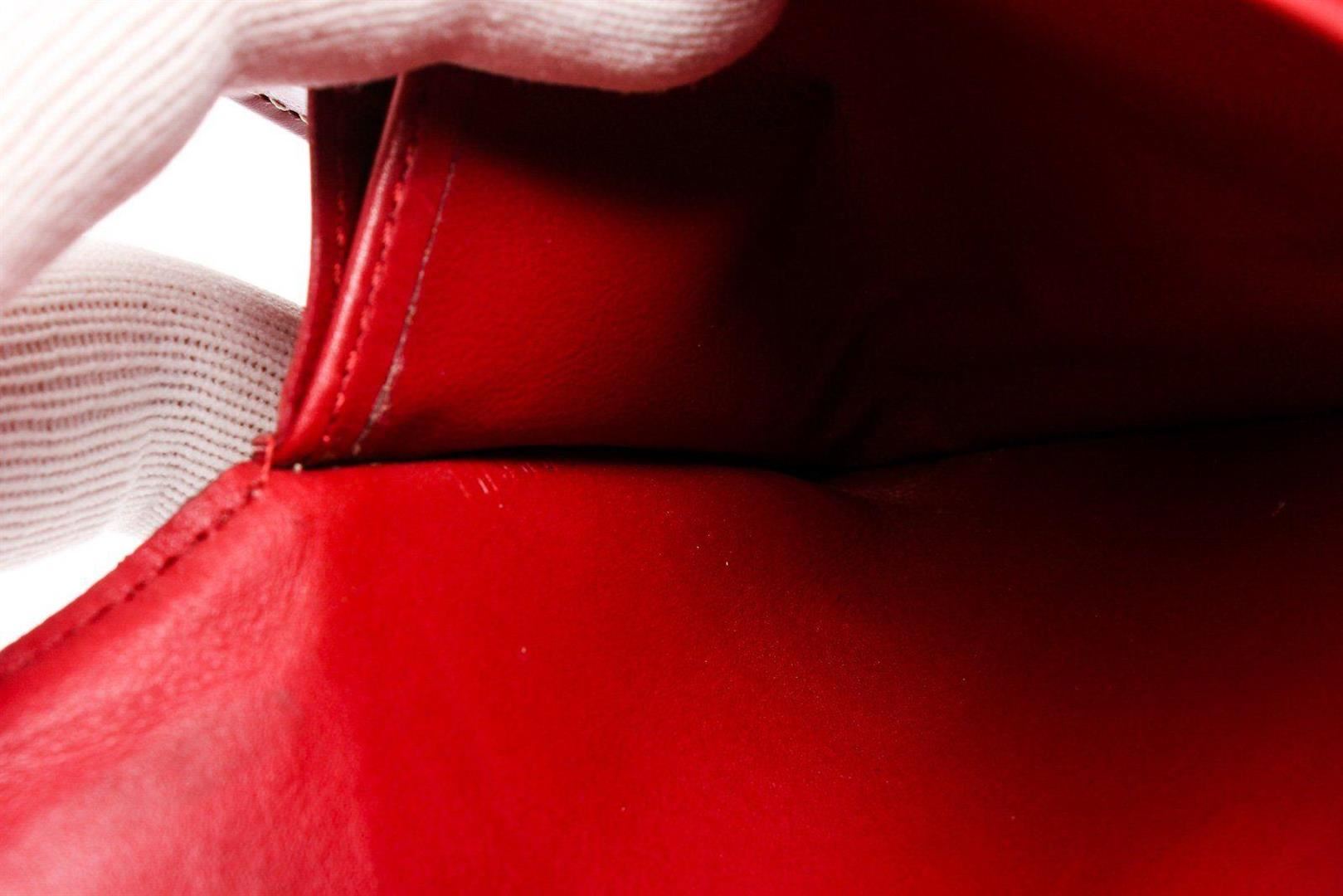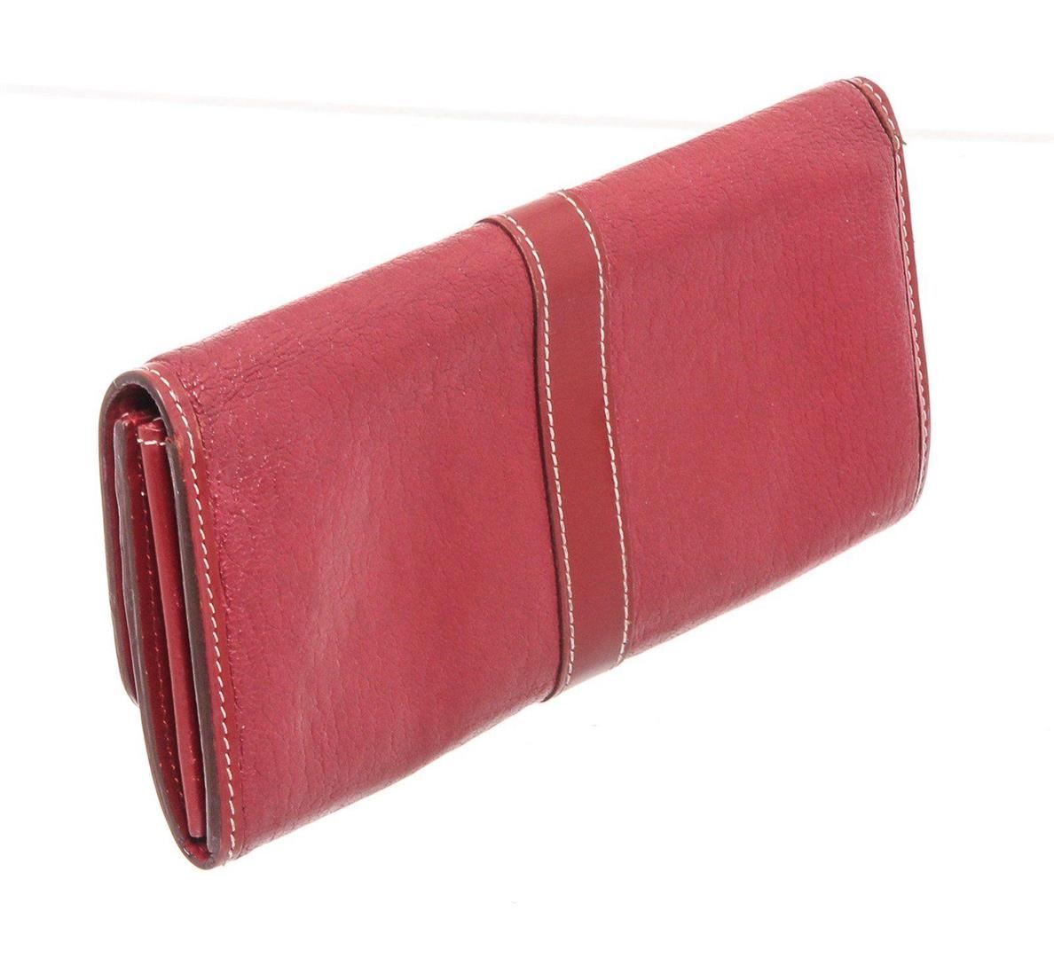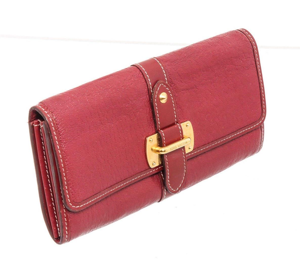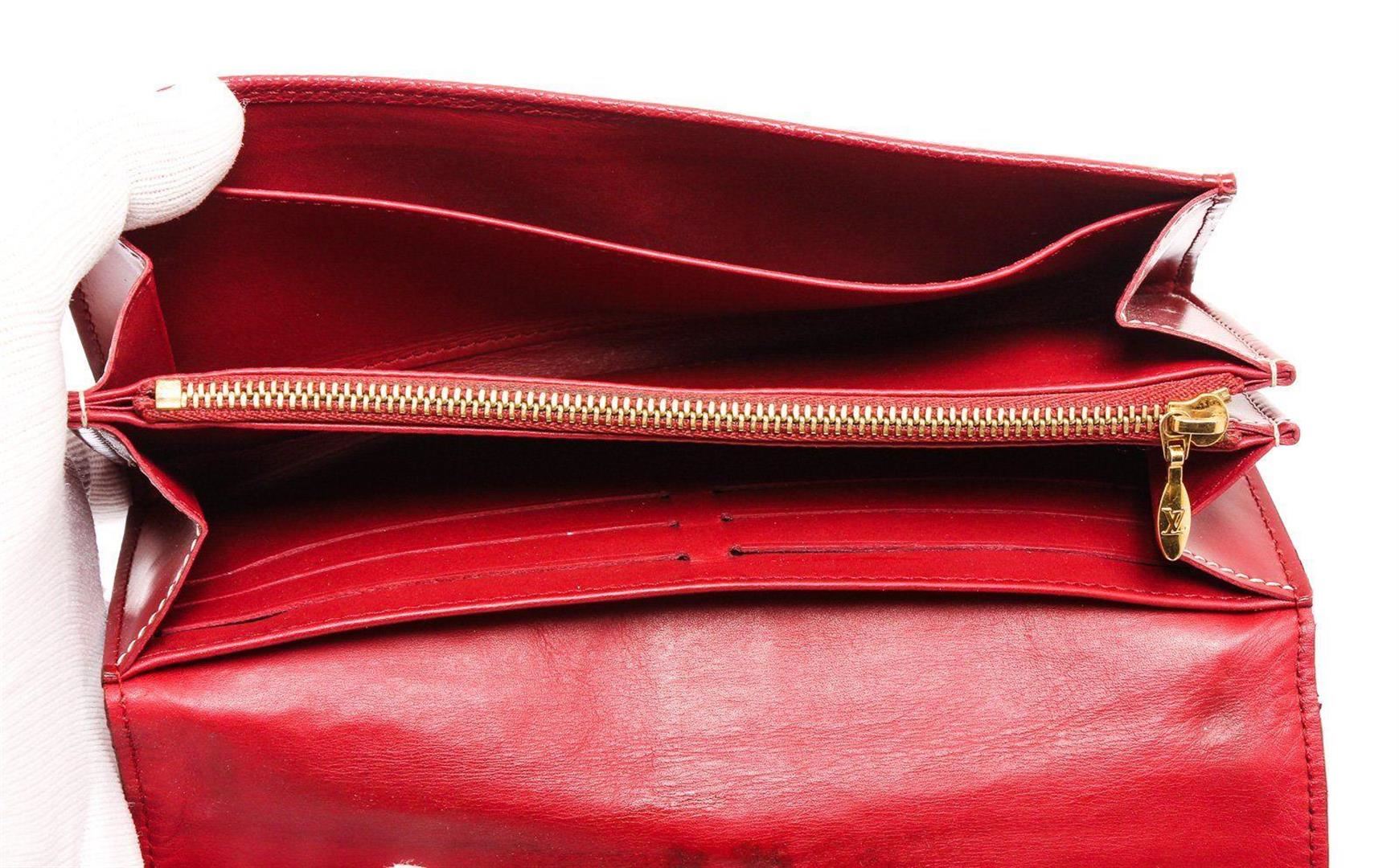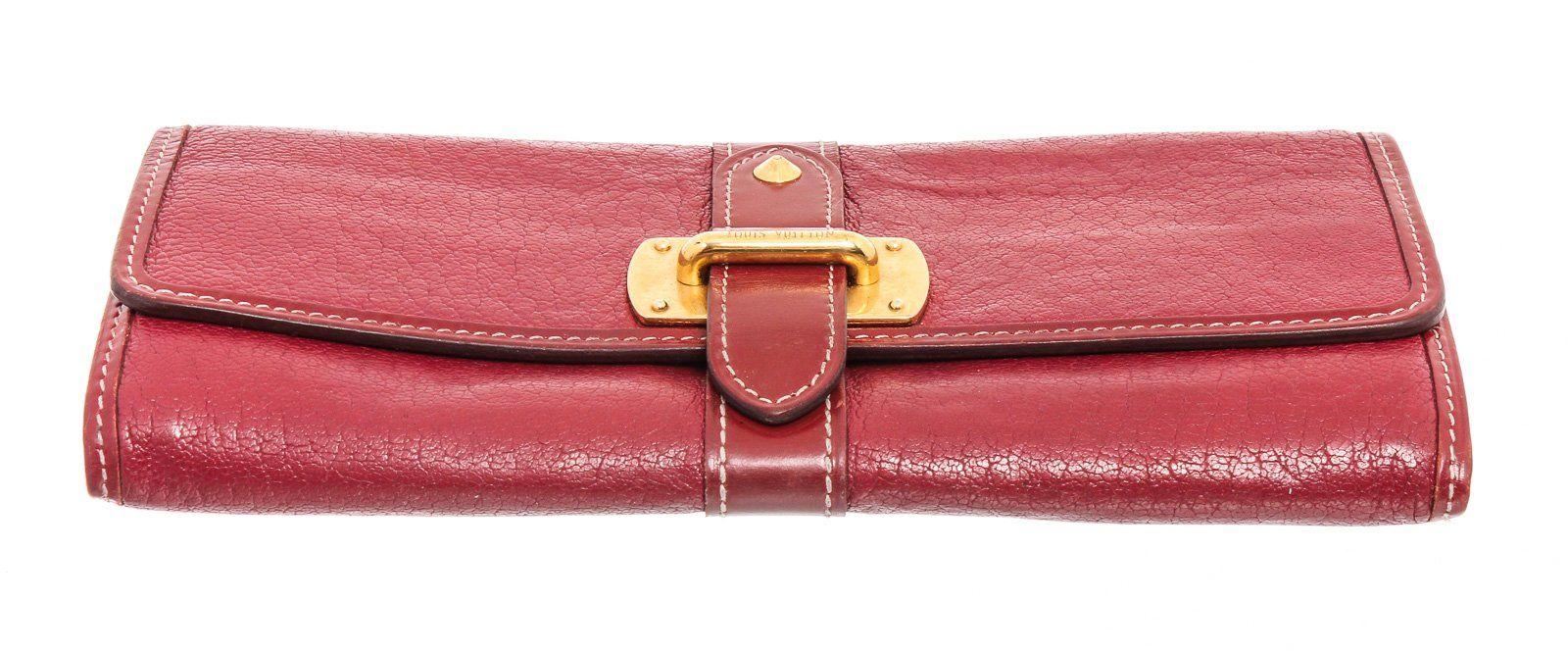 Crimson Suhali leather Louis Vuitton Le Favori wallet with brass hardware, zip pocket at back, six card slots at flap underside, creme contrast stitching throughout, tonal leather lining, three interior compartments; one with zip closure, dual bill compartments at interior walls, eight card slots and snap closure at front flap featuring logo accent. Measurements: Length: 8.25 in / 21 cm Width: 1 in / 3 cm 5.25 in / 13 cm Condition: Pre-Owned Good overall, please see photographs for detail.