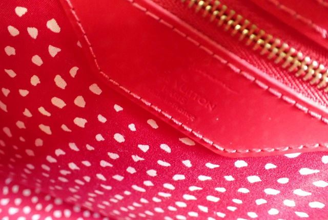 One Louis Vuitton Red Vernis Dot Leather Yayoi Kusama Lockit Vertical MM Satchel Bag. Item is sold AS-IS. All available information is listed in the description and shown in the photo. Red monogram Vernis leather with Yayoi Kusama's polka dot print Louis Vuitton Lockit Vertical MM satchel bag with gold-tone hardware, dual rolled handles, red printed canvas lining & three interior pockets, zip closure at top and protective feet at base. Height: 11.5" Width: 15" Depth: 6.5" Handle Drop: 4"