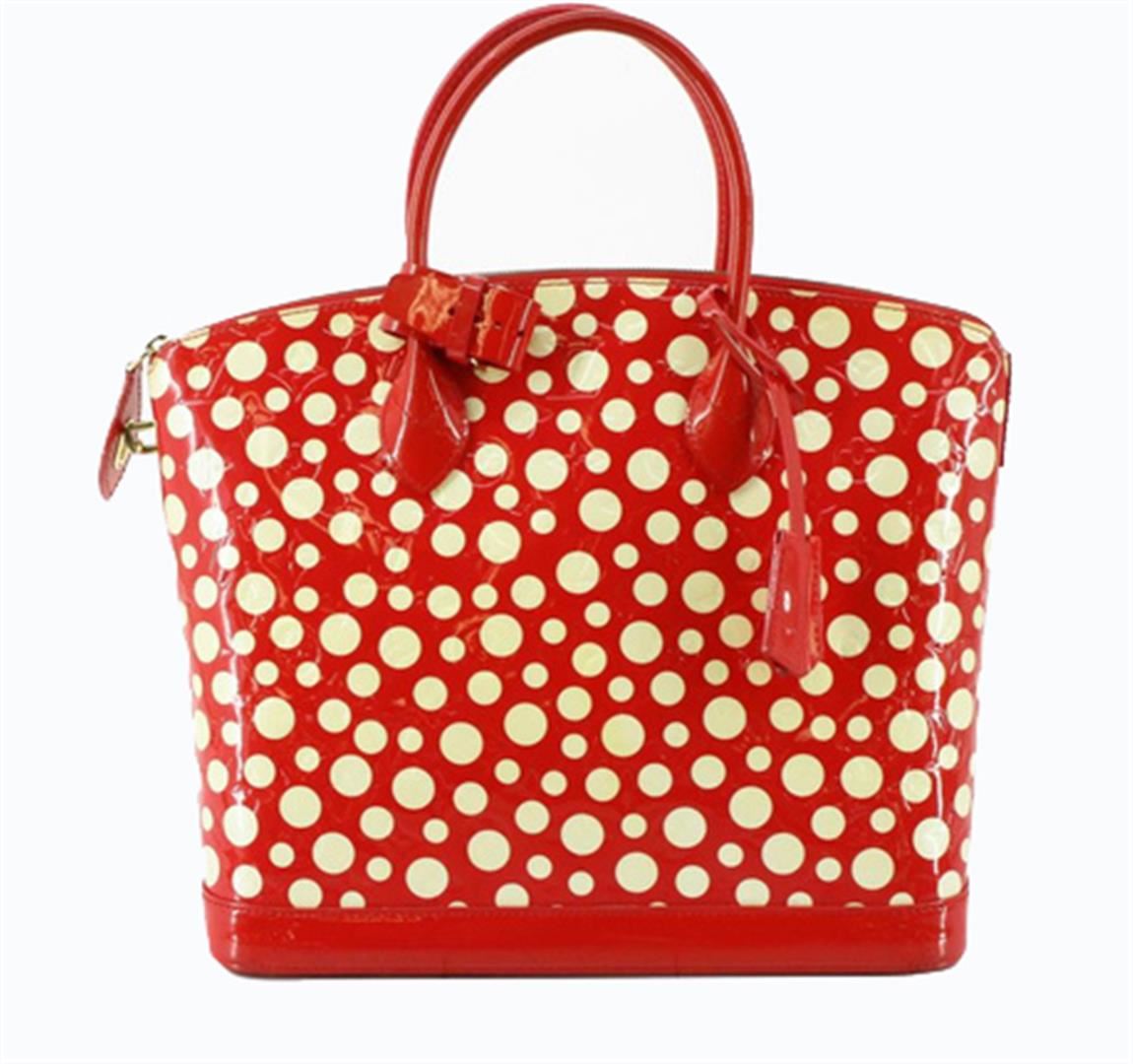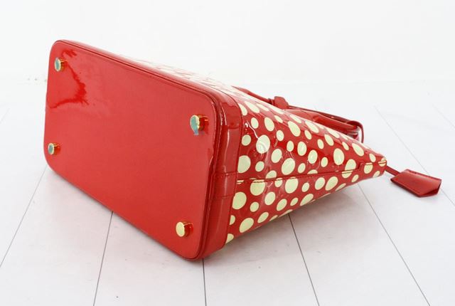 One Louis Vuitton Red Vernis Dot Leather Yayoi Kusama Lockit Vertical MM Satchel Bag. Item is sold AS-IS. All available information is listed in the description and shown in the photo. Red monogram Vernis leather with Yayoi Kusama's polka dot print Louis Vuitton Lockit Vertical MM satchel bag with gold-tone hardware, dual rolled handles, red printed canvas lining & three interior pockets, zip closure at top and protective feet at base. Height: 11.5" Width: 15" Depth: 6.5" Handle Drop: 4"
