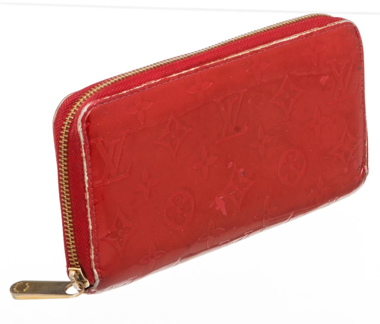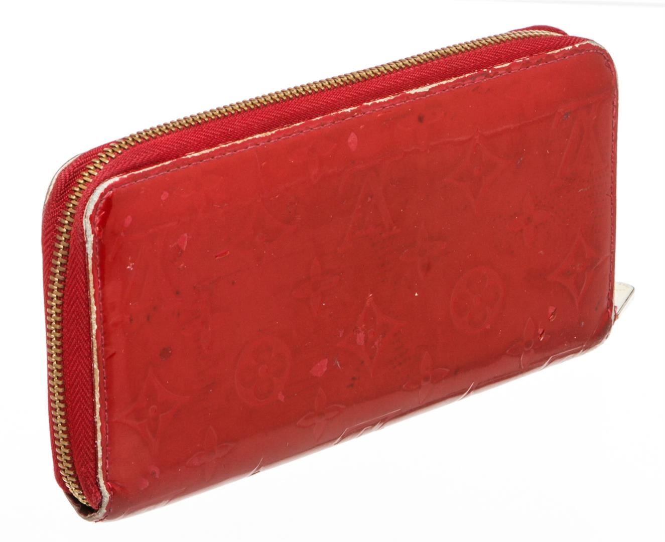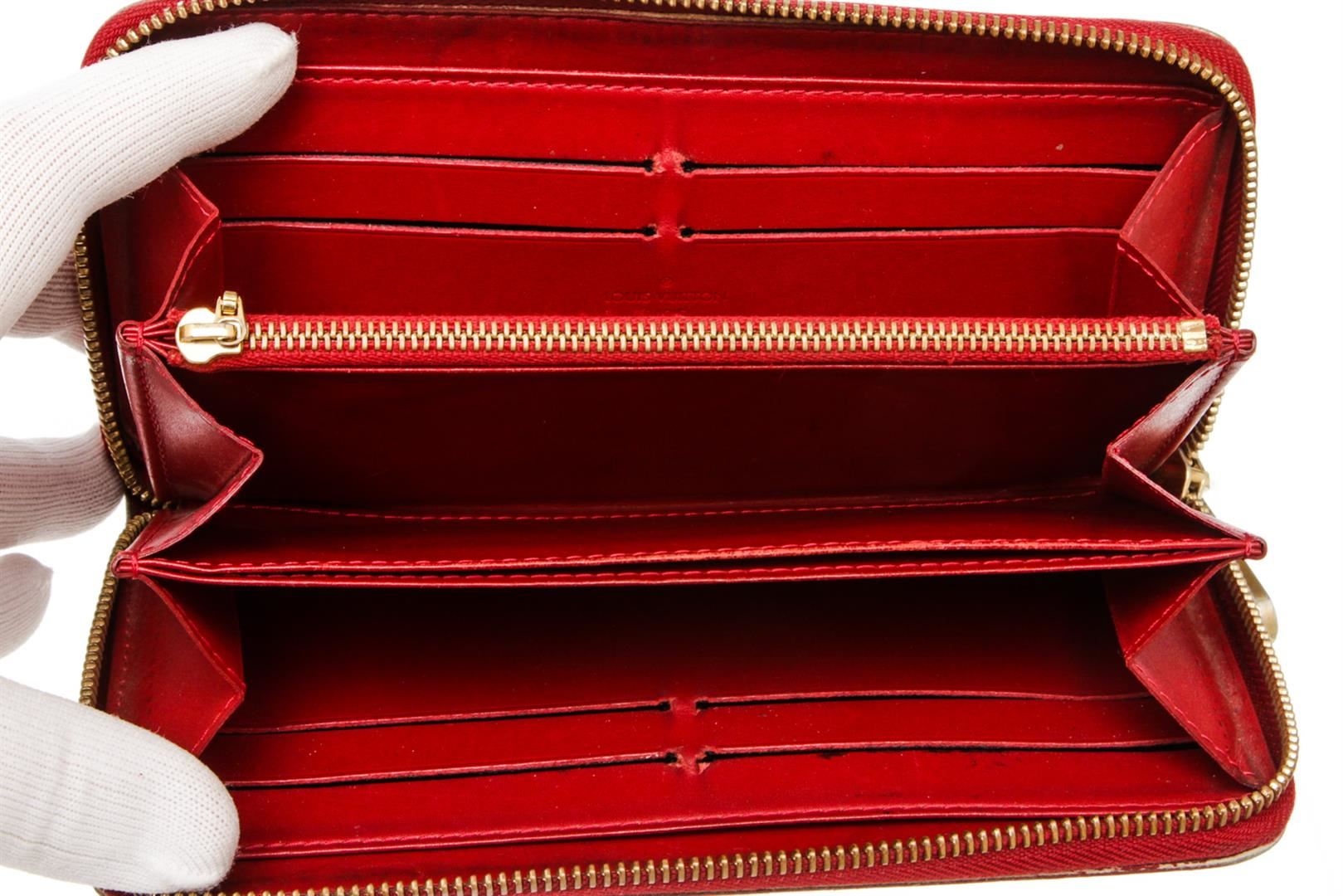 Red Vernis leather Louis Vuitton Zippy wallet with gold-tone hardware, tonal leather lining, four interior compartments; one with zip closure, three bill compartments, eight card slots and zip-around closure.