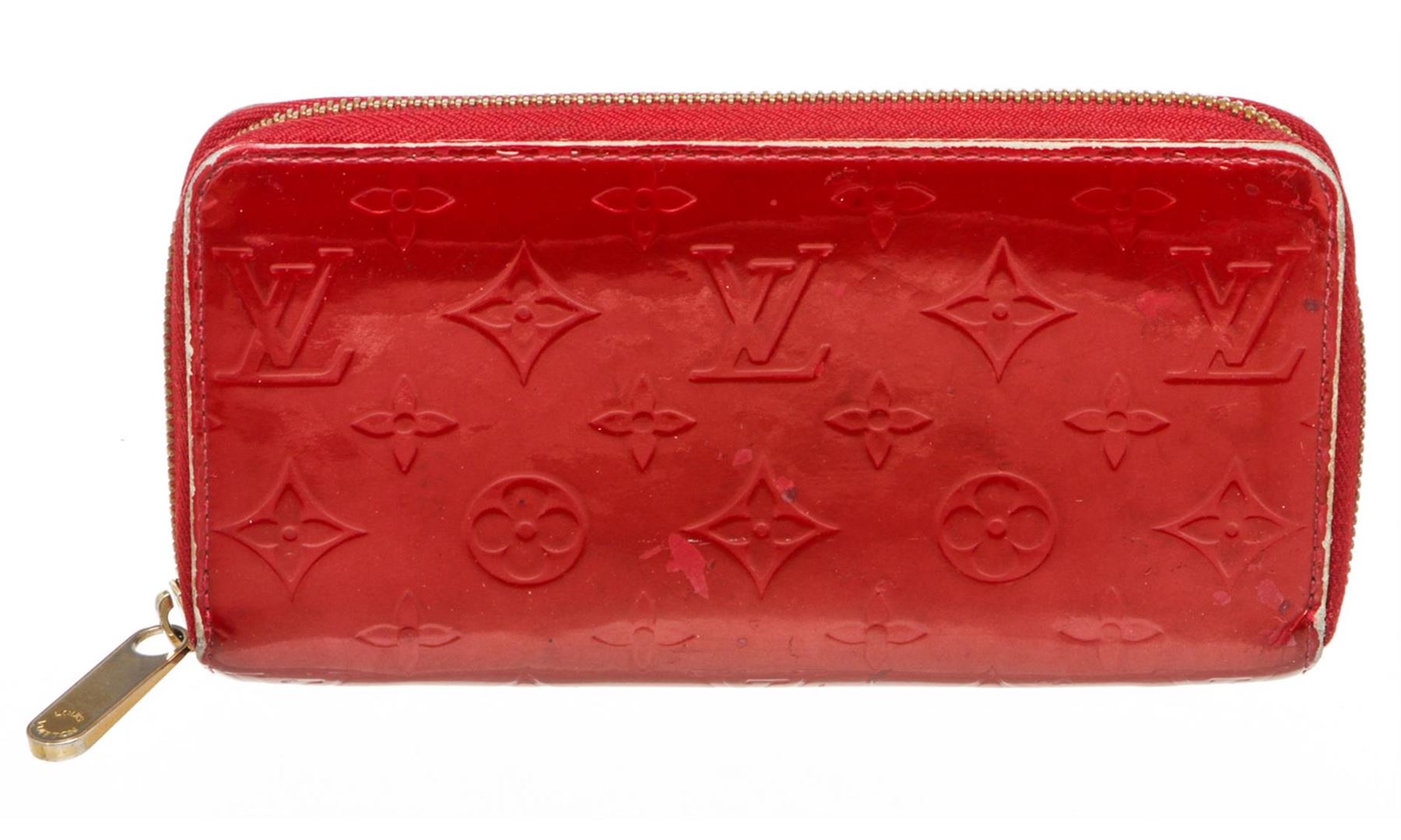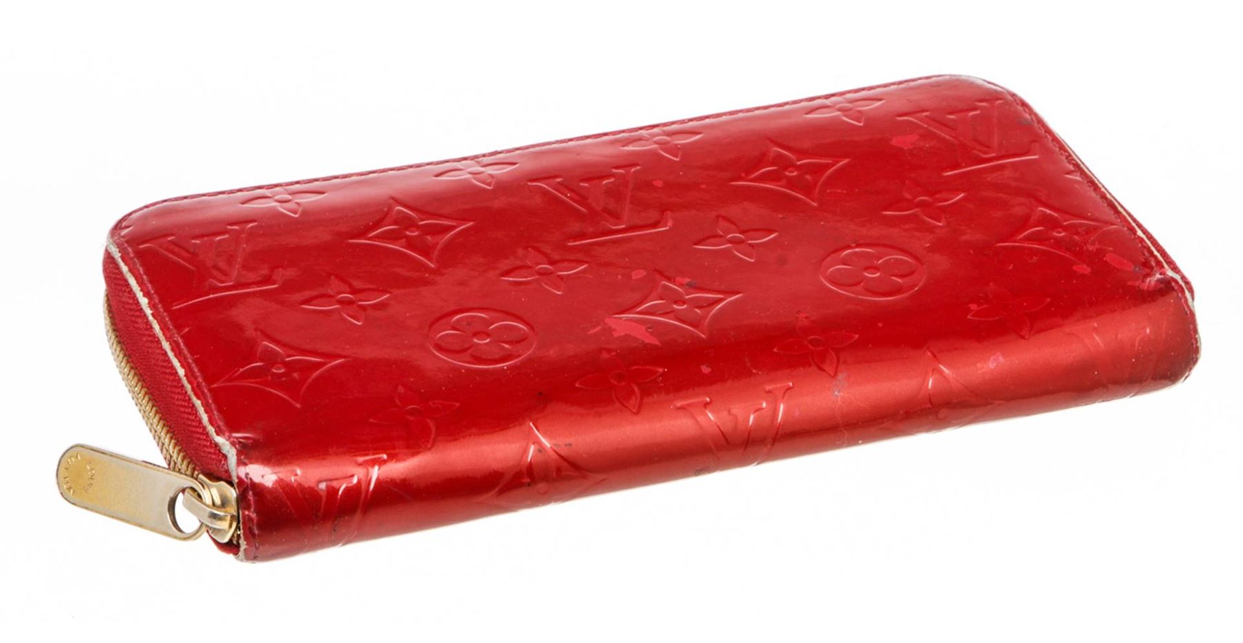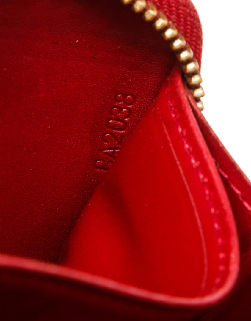 Red Vernis leather Louis Vuitton Zippy wallet with gold-tone hardware, tonal leather lining, four interior compartments; one with zip closure, three bill compartments, eight card slots and zip-around closure.