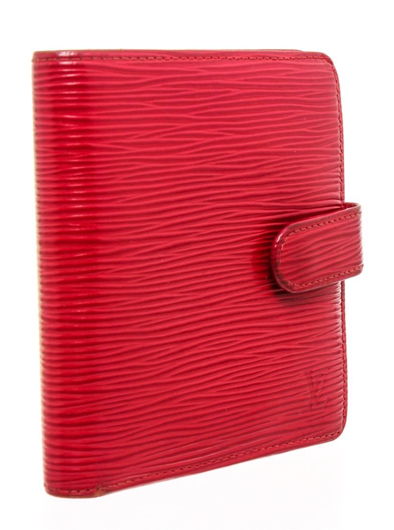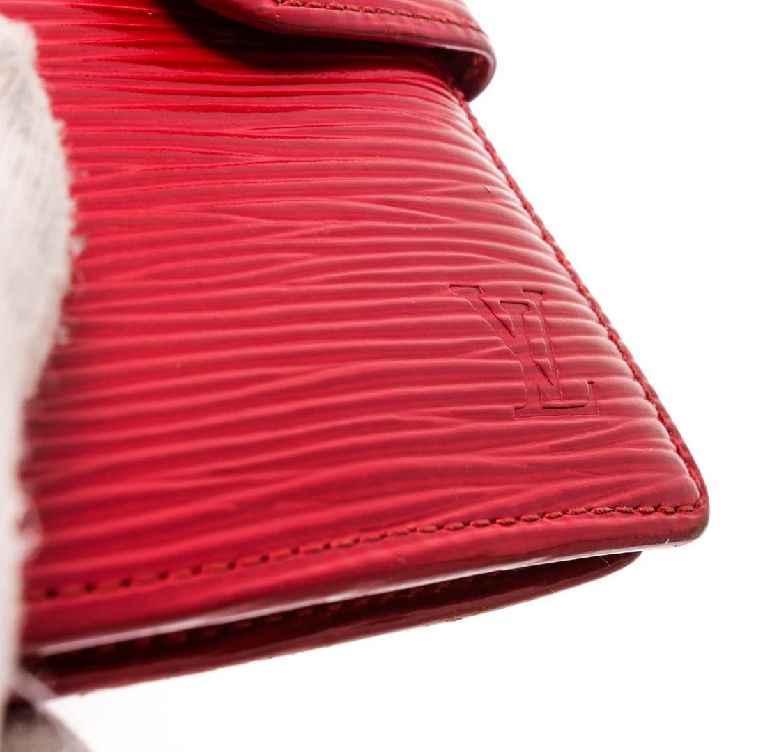 Rouge Epi leather Louis Vuitton Epi Porte Billets compact wallet with brass hardware, embossed logo at front, tonal leather lining, four card slots at interior walls, dual slip pockets, single flap coin compartment, single bill compartment and snap closure at side strap.
