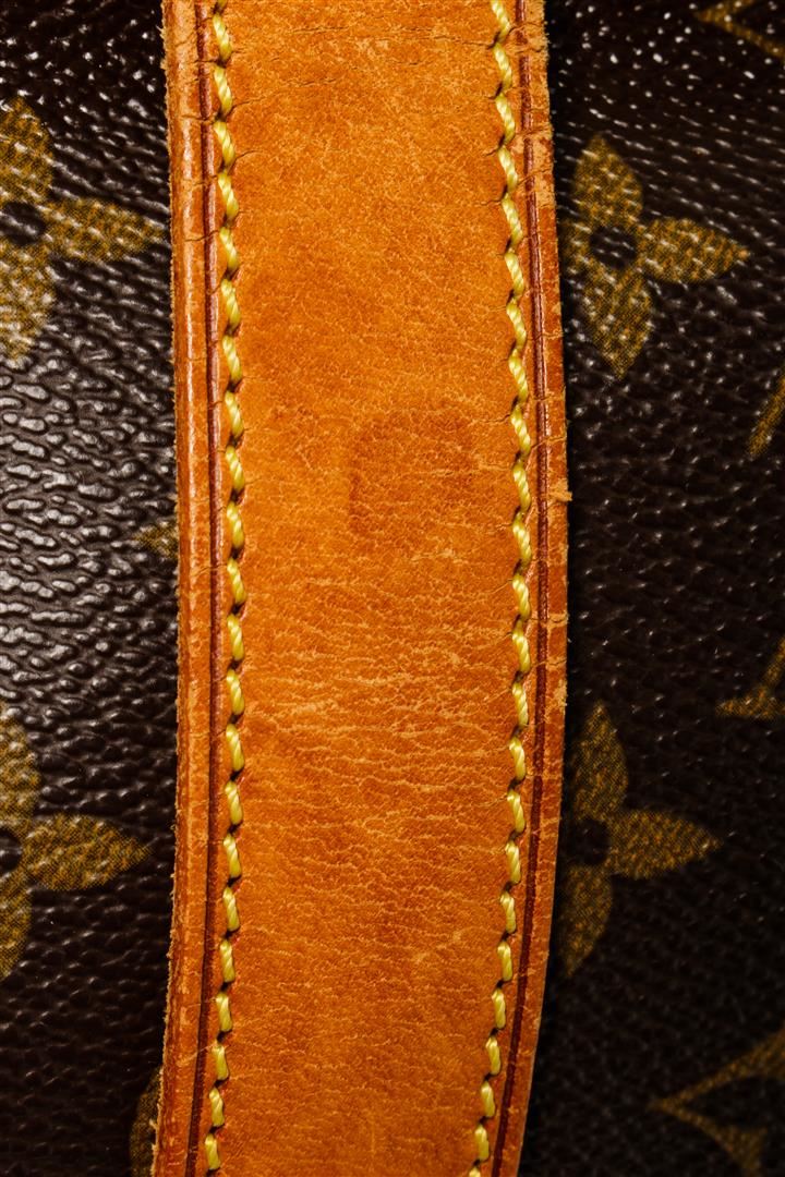 One Louis Vuitton Saumur 35cm. Item is sold AS-IS. All available information is listed in the description and shown in the photo. Brown and tan monogram coated canvas Louis Vuitton Saumur 35 with gold-tone hardware, tan vachetta leather trim, single adjustable flat shoulder strap, brown canvas lining, dual compartments, three pockets at interior walls and dual buckle closures at exterior flap.