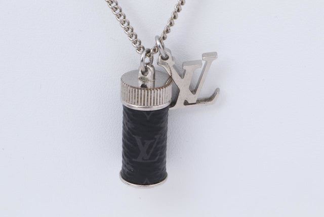 One Louis Vuitton Silver-tone Black Monogram Eclipse Collier Necklace. Item is sold AS-IS. All available information is listed in the description and shown in the photo. With its iconic black Monogram Eclipse canvas sheathed directly onto metal complete with silver-tone hardware, Louis Vuitton Collier necklace has a sophisticated masculine feel. Like an amulet, its cylindrical charm opens to provide its wearer with a secret hiding place.