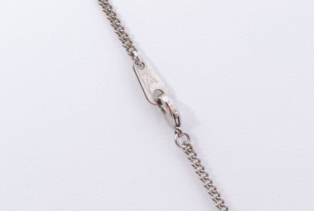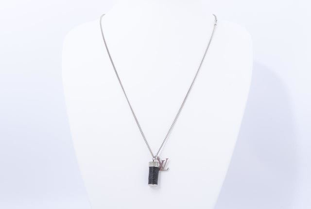 One Louis Vuitton Silver-tone Black Monogram Eclipse Collier Necklace. Item is sold AS-IS. All available information is listed in the description and shown in the photo. With its iconic black Monogram Eclipse canvas sheathed directly onto metal complete with silver-tone hardware, Louis Vuitton Collier necklace has a sophisticated masculine feel. Like an amulet, its cylindrical charm opens to provide its wearer with a secret hiding place.