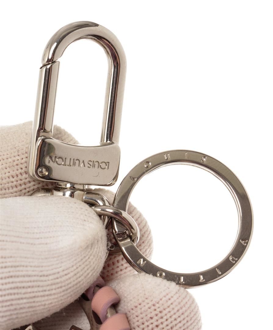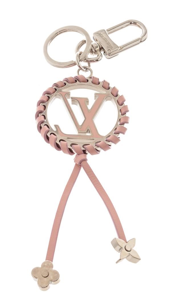 Louis Vuitton Silver-tone Pink Very Bag Charm and Key Holder features pink colored enamel, embellished with a matching leather braid ending in two Monogram Flower charms, and brass hardware with a silver-color finish