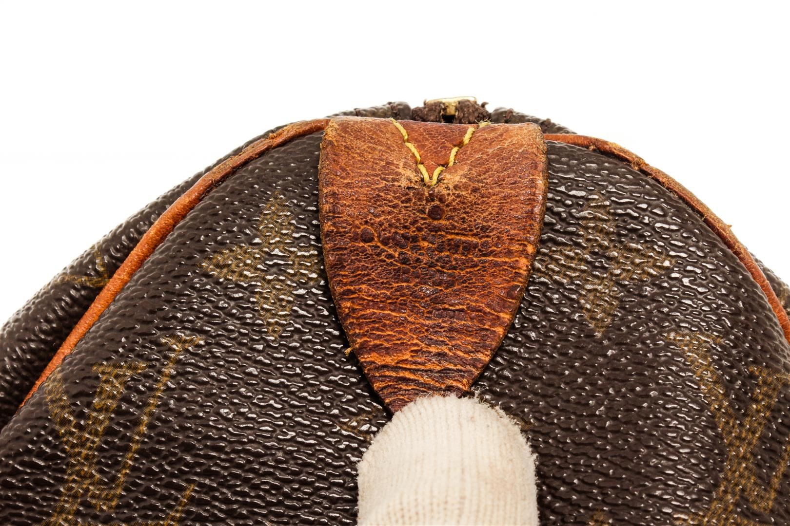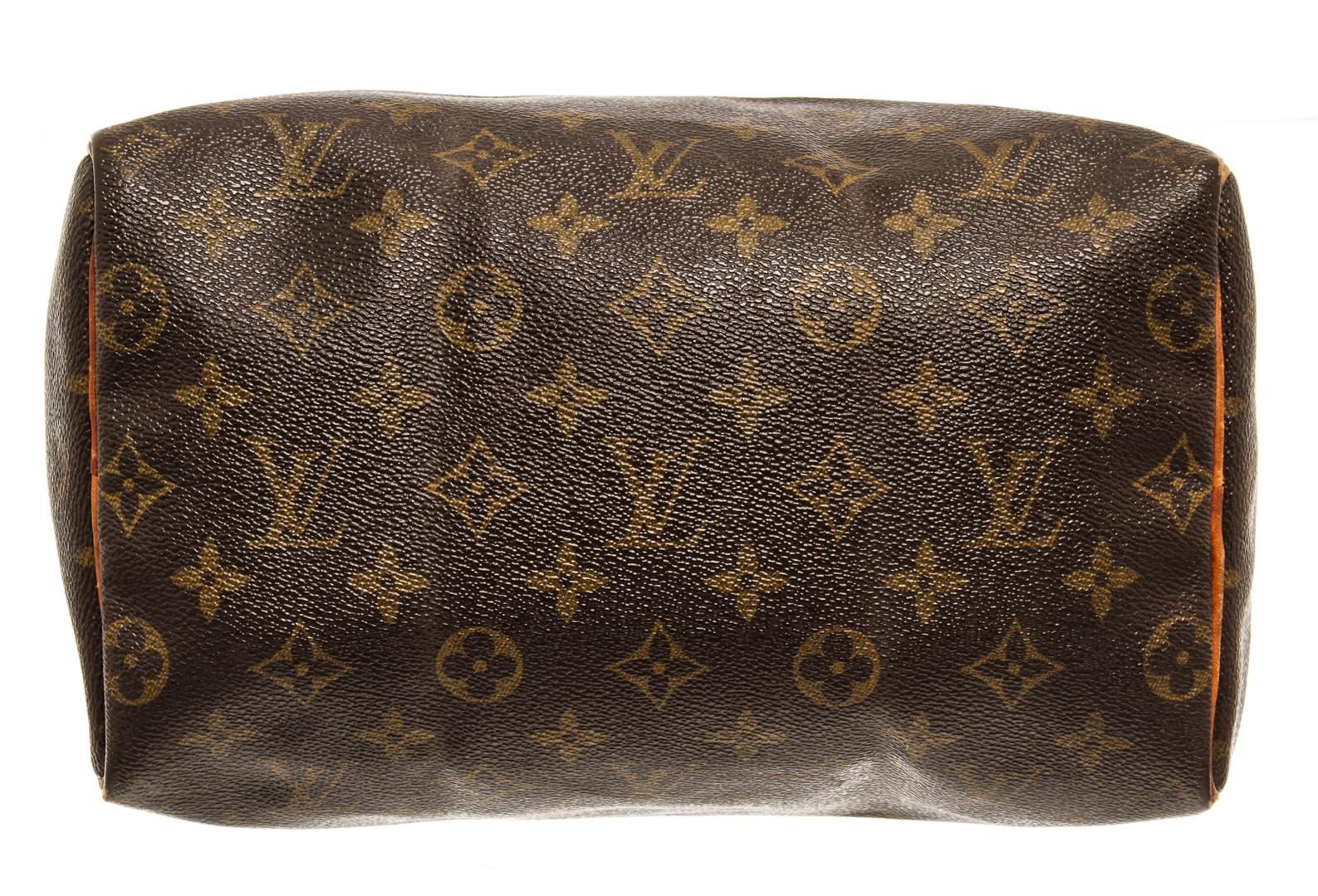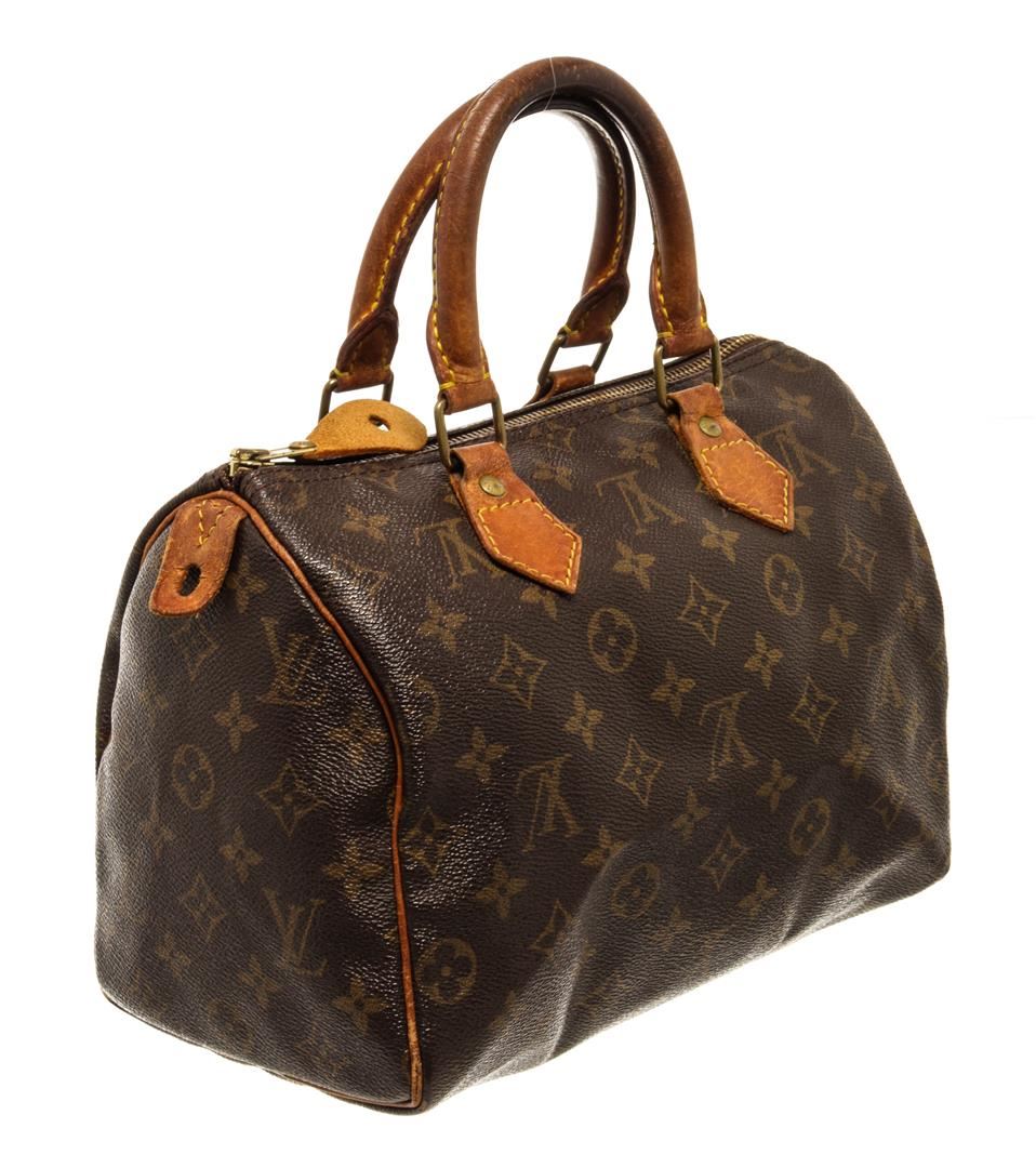 One Louis Vuitton Speedy 25 Handbag. Item is sold AS-IS. All available information is listed in the description and shown in the photo. Louis Vuitton Speedy 25 cm handbag with monogram coated canvas exterior, vanchetta leather top handles, brown fabric lining, one interior slip pocket, top zip closure, and gold-tone hardware.