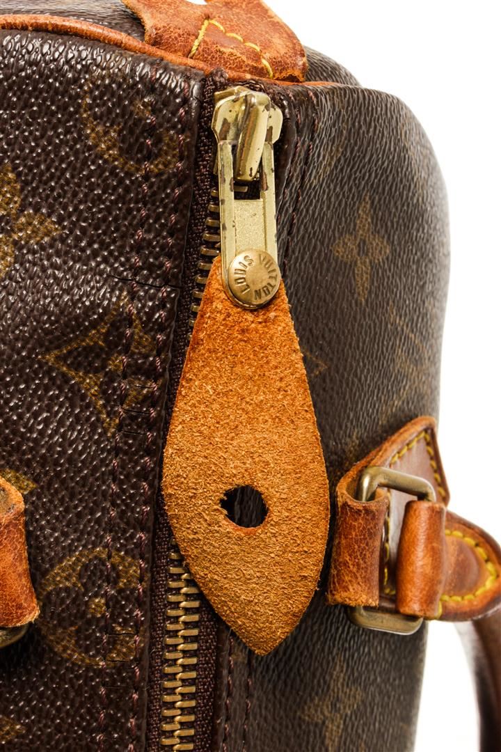 One Louis Vuitton Speedy 25 Handbag. Item is sold AS-IS. All available information is listed in the description and shown in the photo. Louis Vuitton Speedy 25 cm handbag with monogram coated canvas exterior, vanchetta leather top handles, brown fabric lining, one interior slip pocket, top zip closure, and gold-tone hardware.