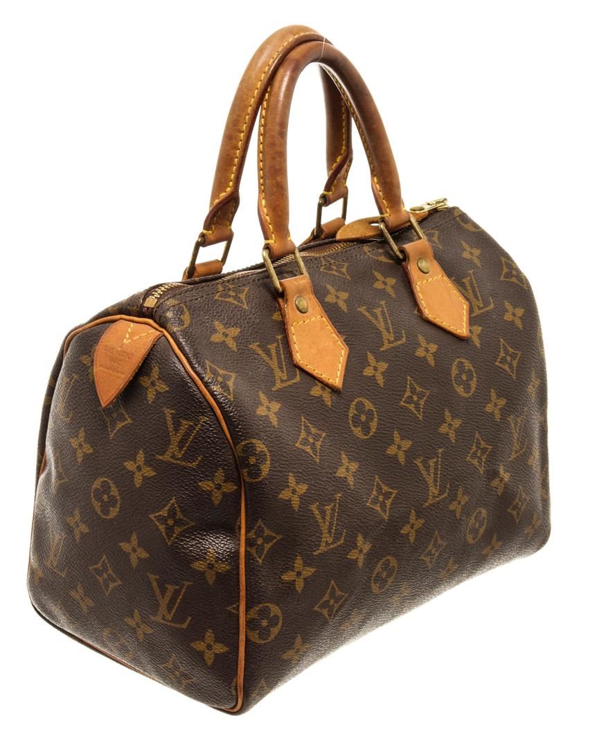 One Louis Vuitton Speedy 25 cm Handbag. Item is sold AS-IS. All available information is listed in the description and shown in the photo. Louis Vuitton Speedy 25 cm handbag with monogram coated canvas exterior, vanchetta leather top handles, brown fabric lining, one interior slip pocket, top zip closure, and gold-tone hardware.