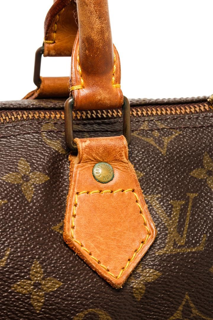 One Louis Vuitton Speedy 25 cm Handbag. Item is sold AS-IS. All available information is listed in the description and shown in the photo. Louis Vuitton Speedy 25 cm handbag with monogram coated canvas exterior, vanchetta leather top handles, brown fabric interior, one interior slip pocket, top zip closure, and gold-tone hardware.