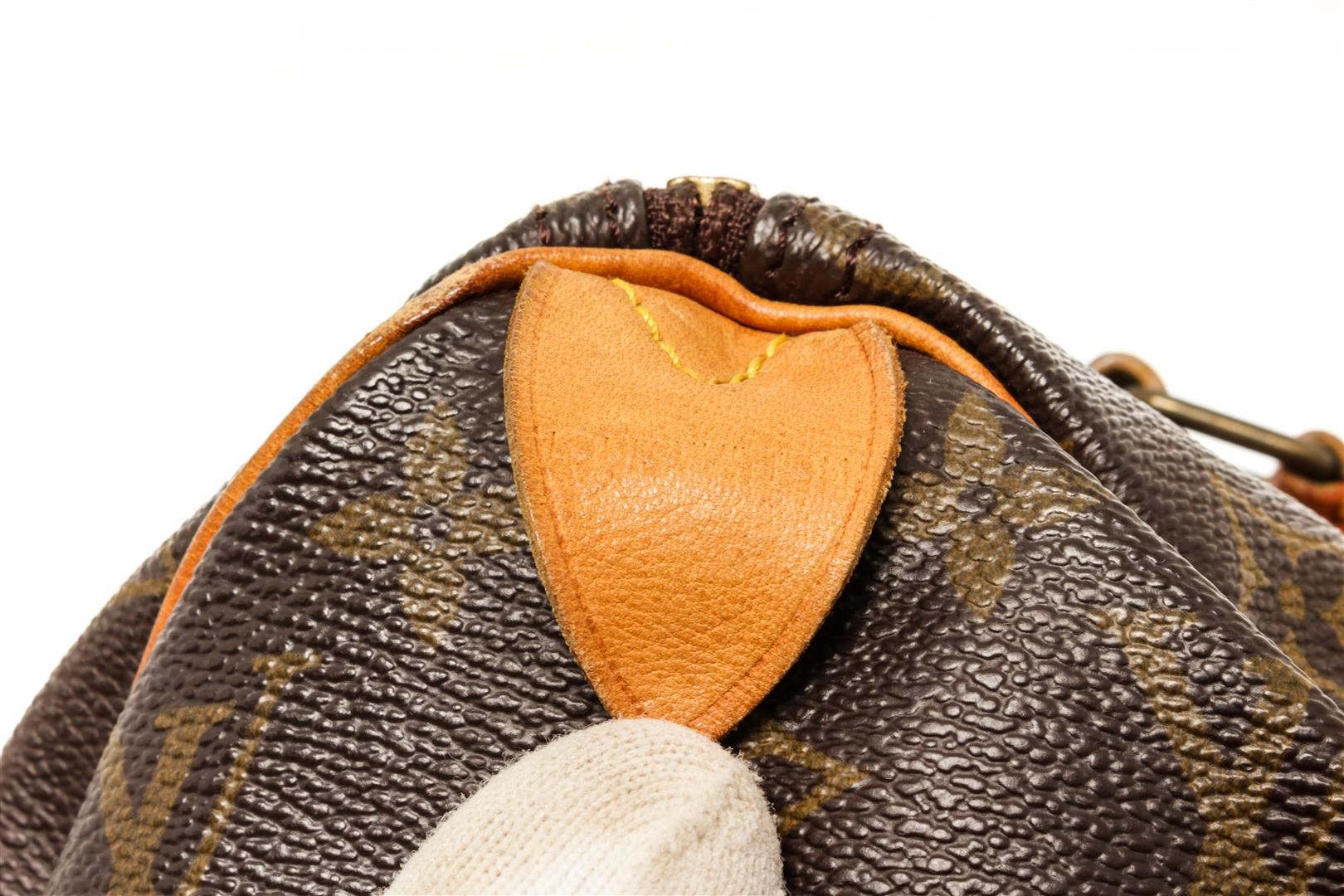 One Louis Vuitton Speedy 25 cm Handbag. Item is sold AS-IS. All available information is listed in the description and shown in the photo. Louis Vuitton Speedy 25 cm handbag with monogram coated canvas exterior, vanchetta leather top handles, brown fabric lining, one interior slip pocket, top zip closure, and gold-tone hardware.