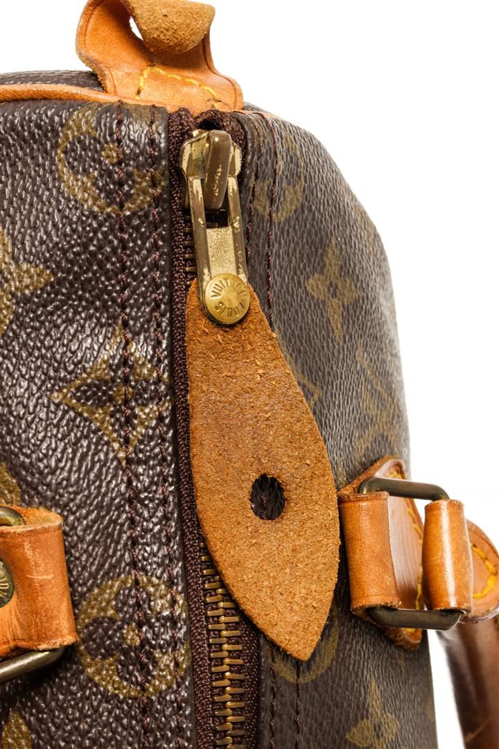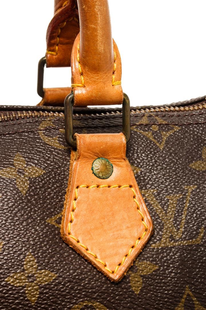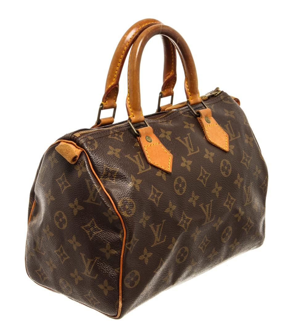 One Louis Vuitton Speedy 25 cm Handbag. Item is sold AS-IS. All available information is listed in the description and shown in the photo. Louis Vuitton Speedy 25 cm handbag with monogram coated canvas exterior, vanchetta leather top handles, brown fabric lining, one interior slip pocket, top zip closure, and gold-tone hardware.