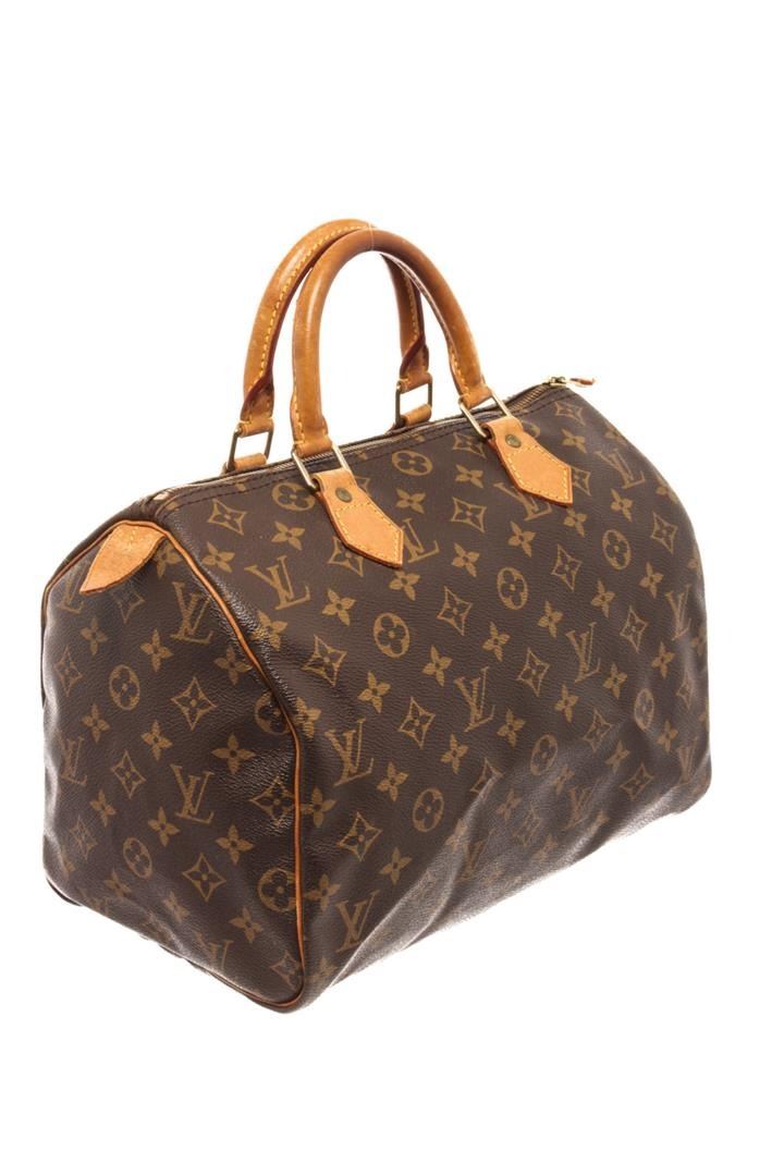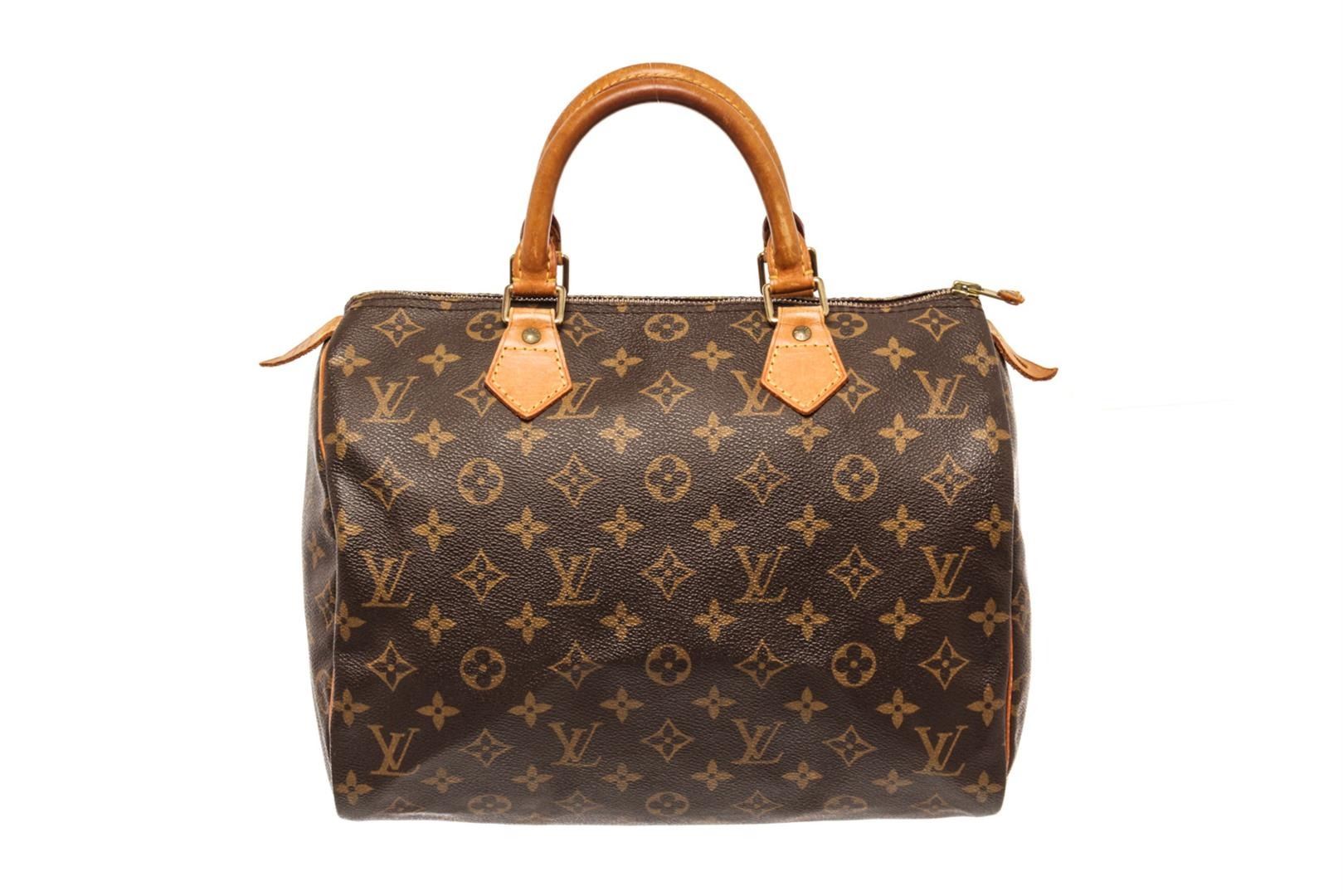 Louis Vuitton Speedy 30 Boston Bag Brown Monogram Coated Canvas. Brand: Louis Vuitton, Style: Speedy 30, Type: Boston Bag, Exterior Color: Brown Monogram, Exterior Material: Coated Canvas, Exterior Pockets: None, Interior Color: Brown, Interior Material: Canvas, Interior Pockets: One slip, Closure: Zip, Handle/Strap Type: Top Handle, Length: 11.8, Width: 6.7, Height: 8.3, Handle Drop: 3.5. Condition: Vachetta is worn. Item is sold AS-IS and all information pertaining to this lot is available in the photos or this description.