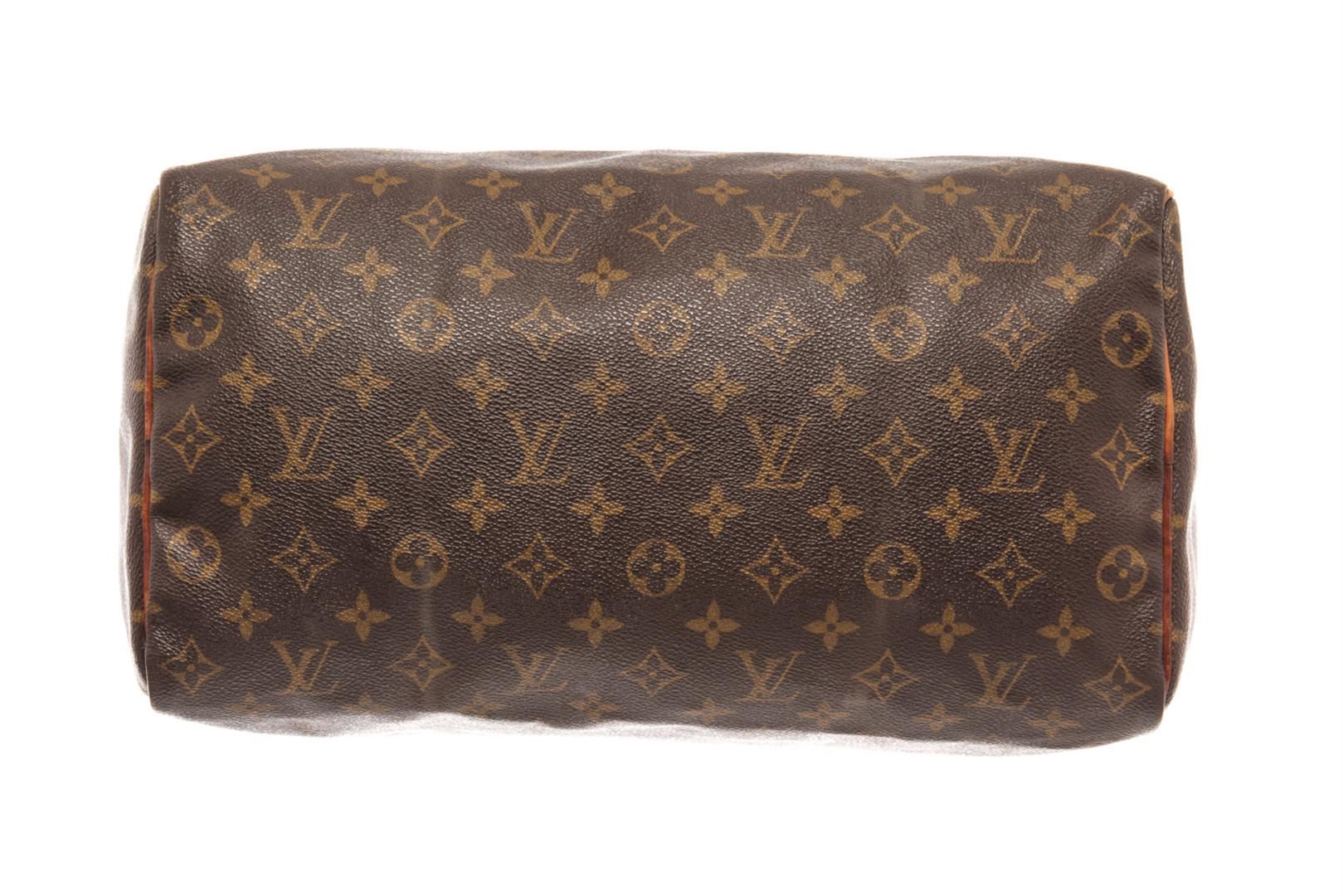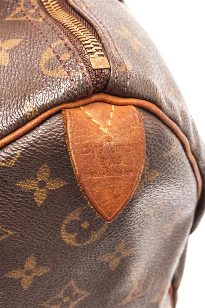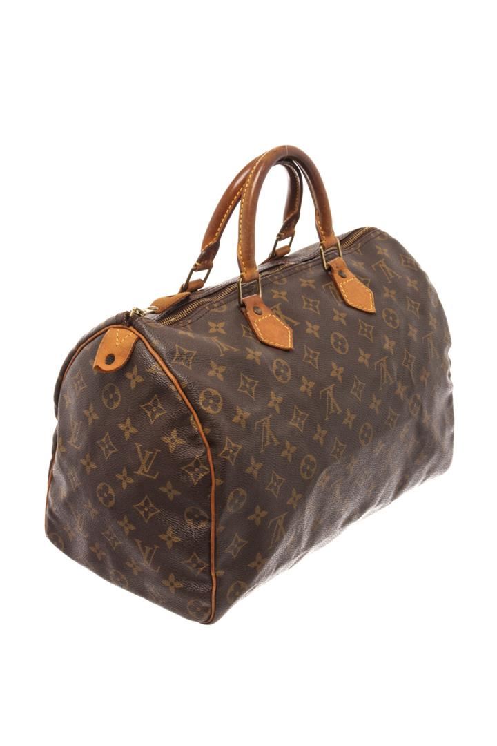 Louis Vuitton Speedy 35 Boston Bag. Brand: Louis Vuitton, Style: Speedy 35, Type: Boston Bag, Exterior color: Brown Monogram, Exterior material: Coated Canvas, Interior color: Brown, Interior material: Canvas, Length: 14, Width: 7, Height: 9. Item is sold