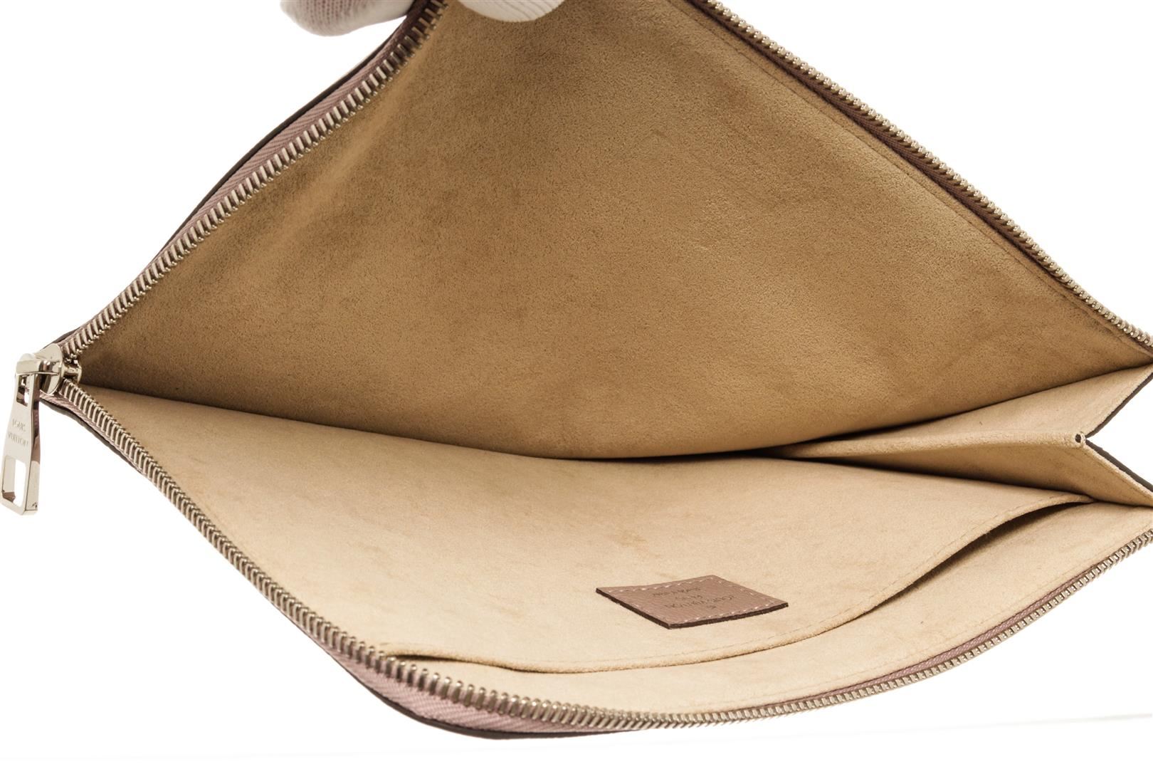 One Louis Vuitton Taupe Leather Pochette Jour Clutch. Item is sold AS-IS. All available information is listed in the description and shown in the photo. Louis Vuitton Taupe Leather Pochette Jour Clutch with exterior color neutral, exterior material leather, interior material microfiber, hardware color silver, 9"W x 6.5"H x 0.5"D / 22.86 x 16.51 x 0.5 Cm