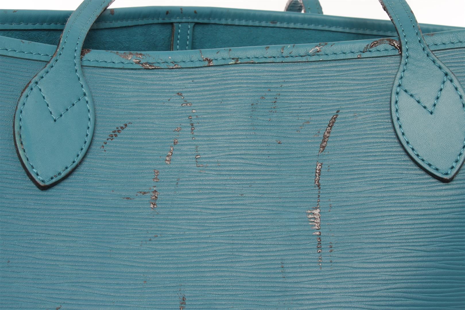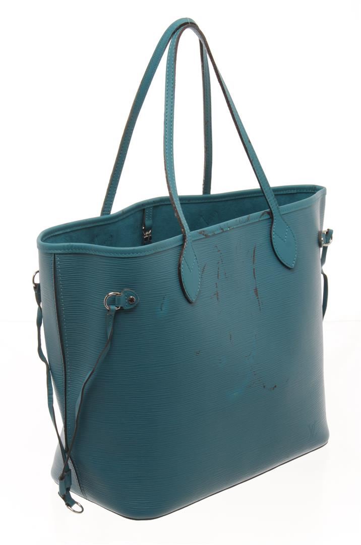 One Louis Vuitton Teal Blue Epi Leather Neverfull MM Tote Bag. Item is sold AS-IS. All available information is listed in the description and shown in the photo. Louis vuitton epi leather Neverfull MM tote bag with silver-tone hardware. PLEASE NOTE: The strap trim has melted and stain the exterior of the bag throughout. Please see photographs. 12.5"(W) x 11.5"(H) x 6.5"(D) / 31.75 x 29.21 x 16.51 CM