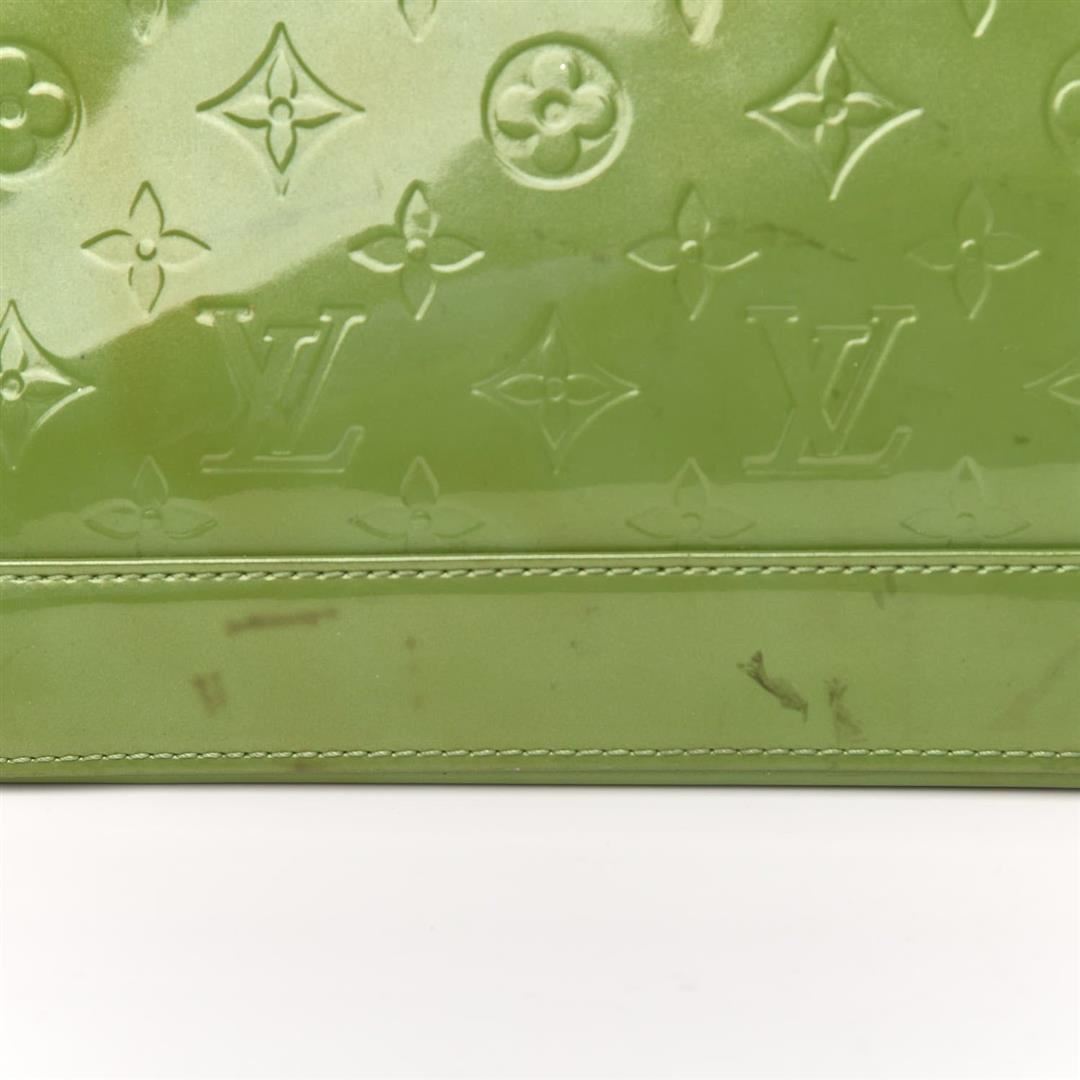 Louis Vuitton Alma GM Bag is crafted from green Vernis Monogram leather, gold-tone hardware and dual top handles and protective studs at base. The double zip closure opens to a roomy interior with leather lining.