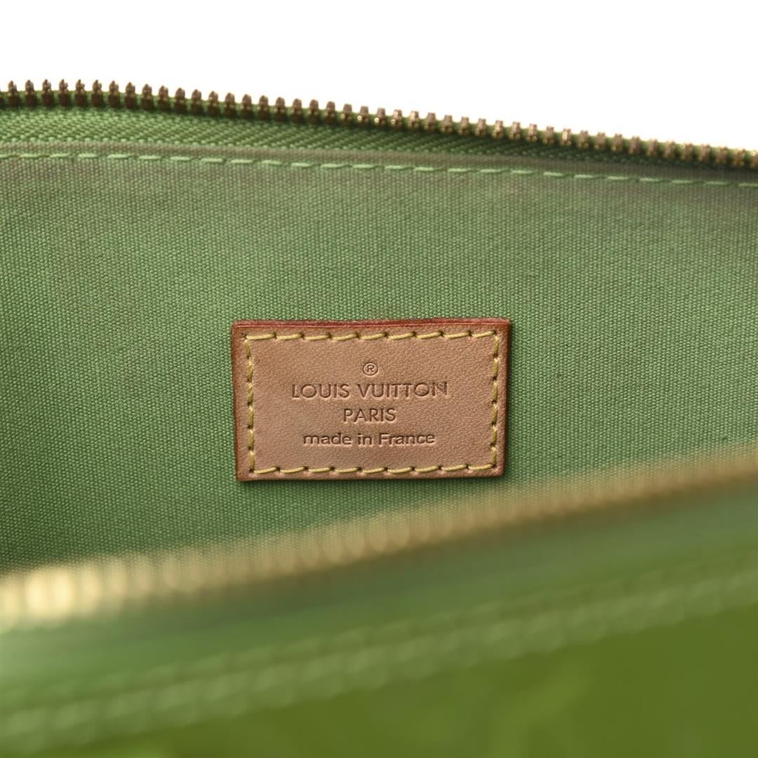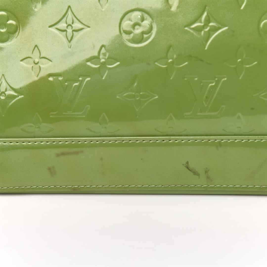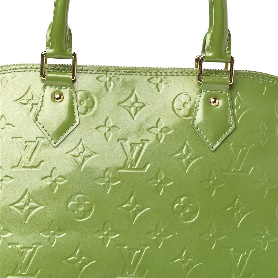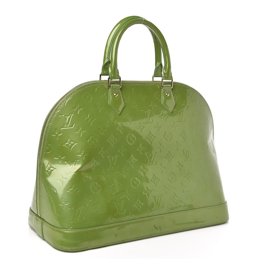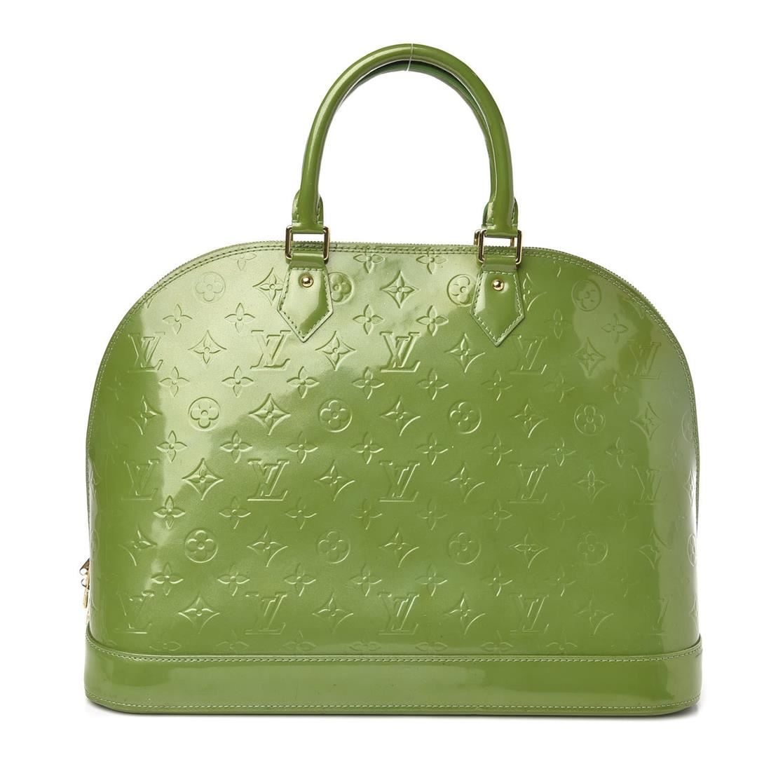 Louis Vuitton Alma GM Bag is crafted from green Vernis Monogram leather, gold-tone hardware and dual top handles and protective studs at base. The double zip closure opens to a roomy interior with leather lining. 15.25" L x 7.4" W x 11.75" H Handle Dr